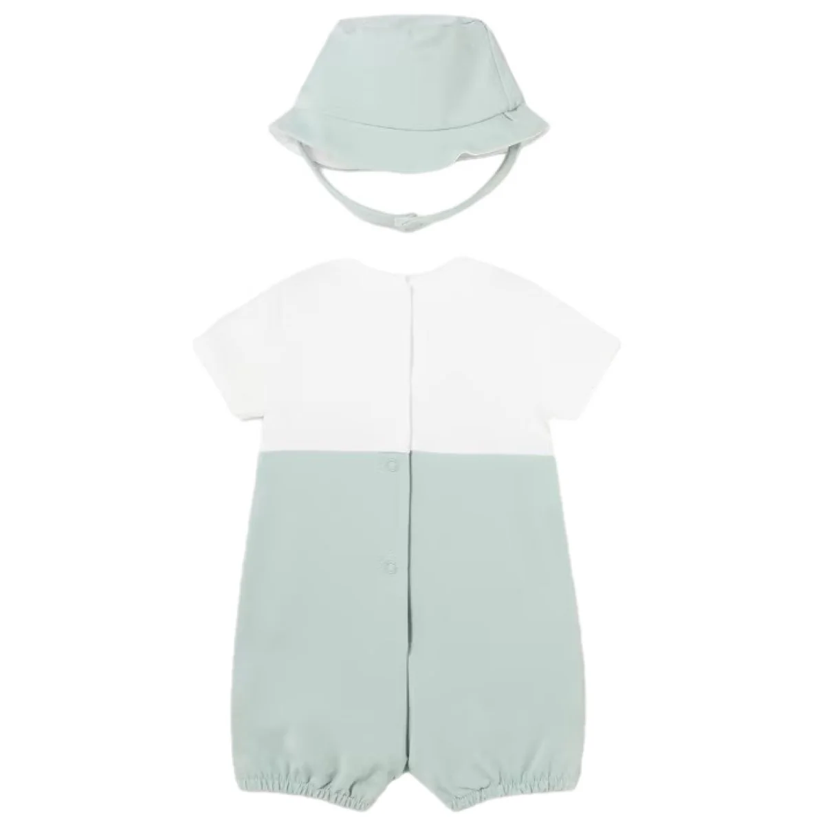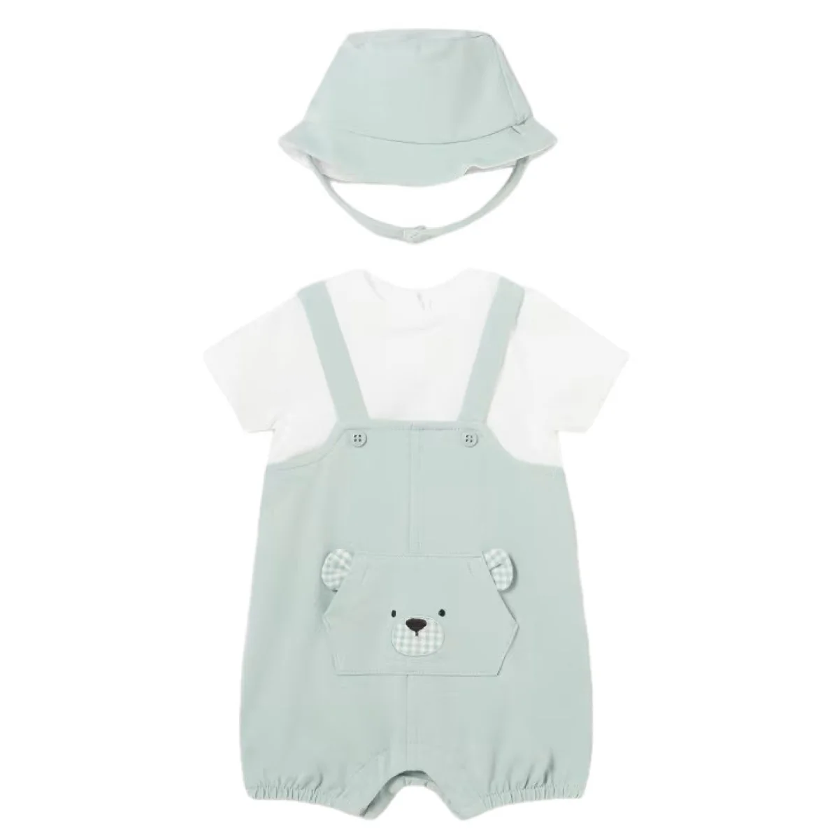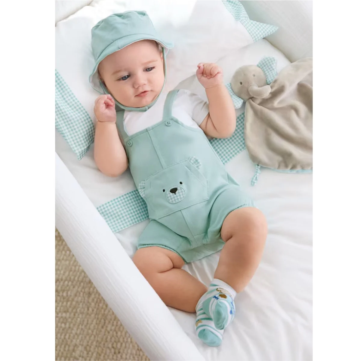 Pagliaccetto MAYORAL in cotone modello finta salopette con tasca applicata con ricami e rifiniture in colori a contrasto, finti bottoncini applicati, chiusura con clips sul retro. In coordinato cappello in cotone con laccetto chiusura stretch.