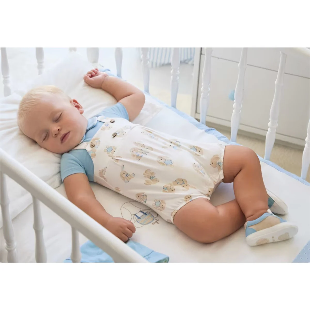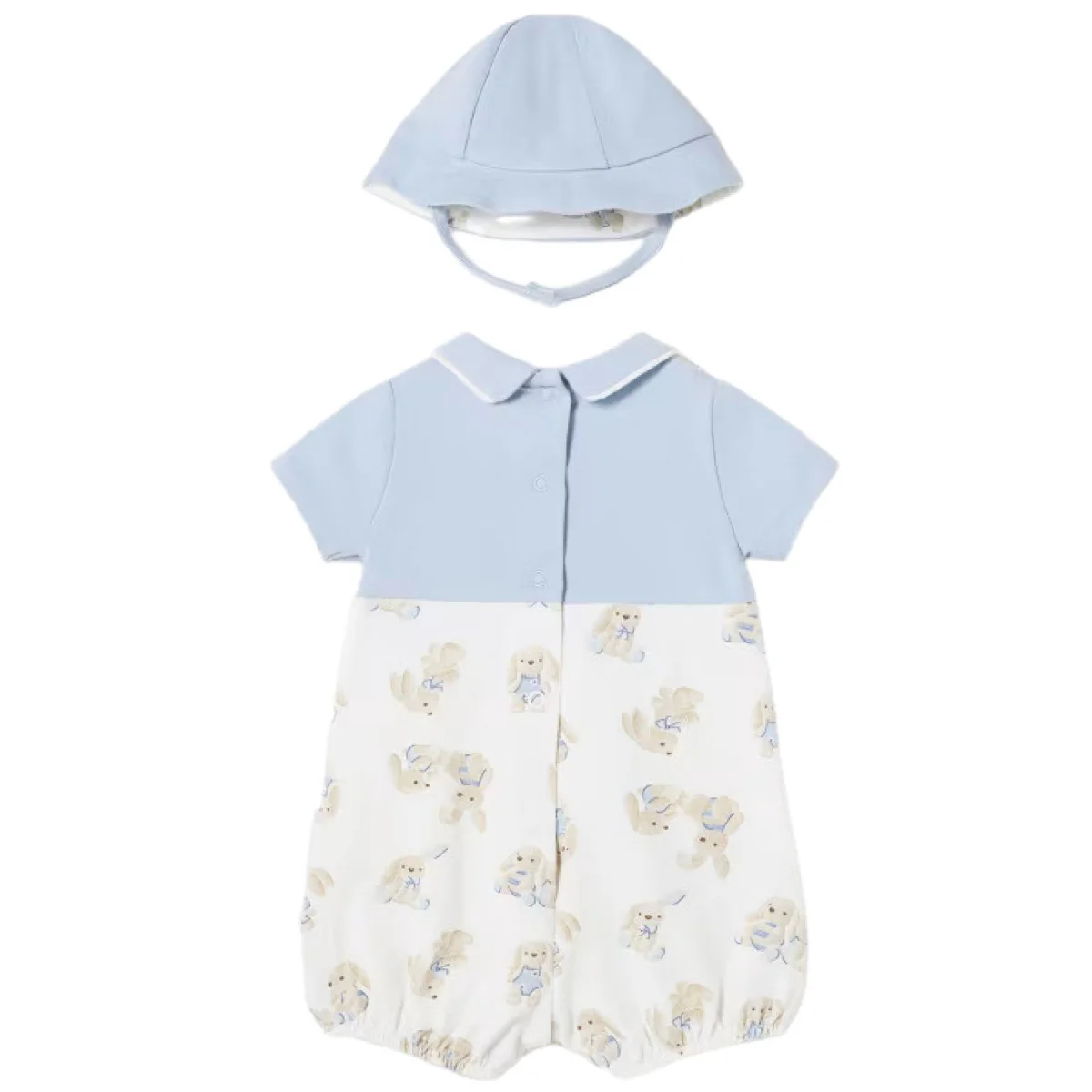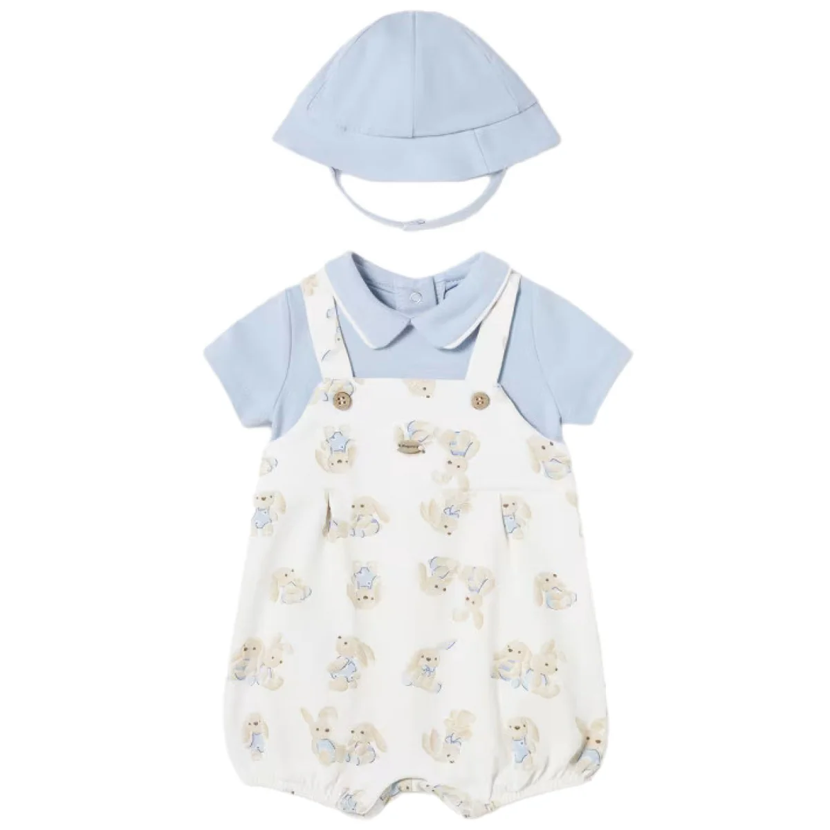 Pagliaccetto MAYORAL in cotone, modello finta salopette a fantasia coniglietti in colore a contrasto, logo e finti bottoncini applicati, elastico al giro gamba, chiusura con clips sul retro. In dotazione cappellino in coordinato con chiusura velcro.