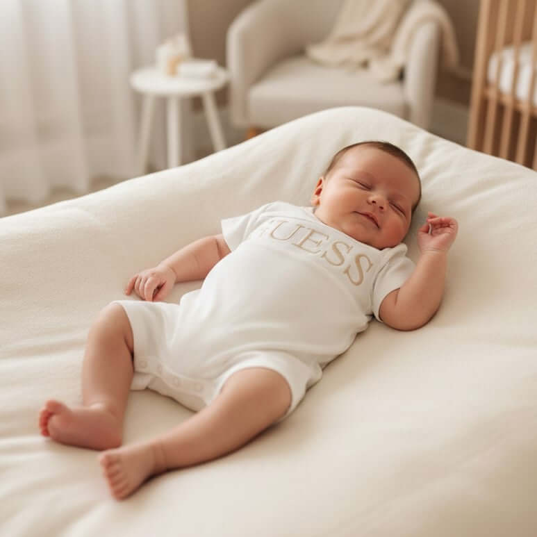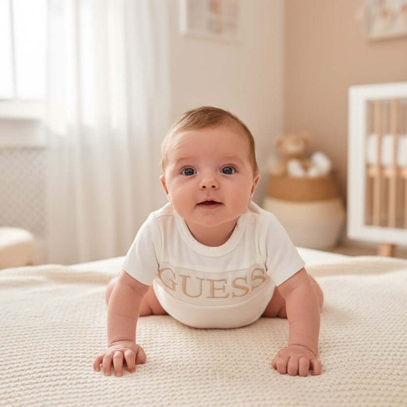 Pagliaccetto GUESS beige in cotone con logo ricamato dotato di scatola regalo .