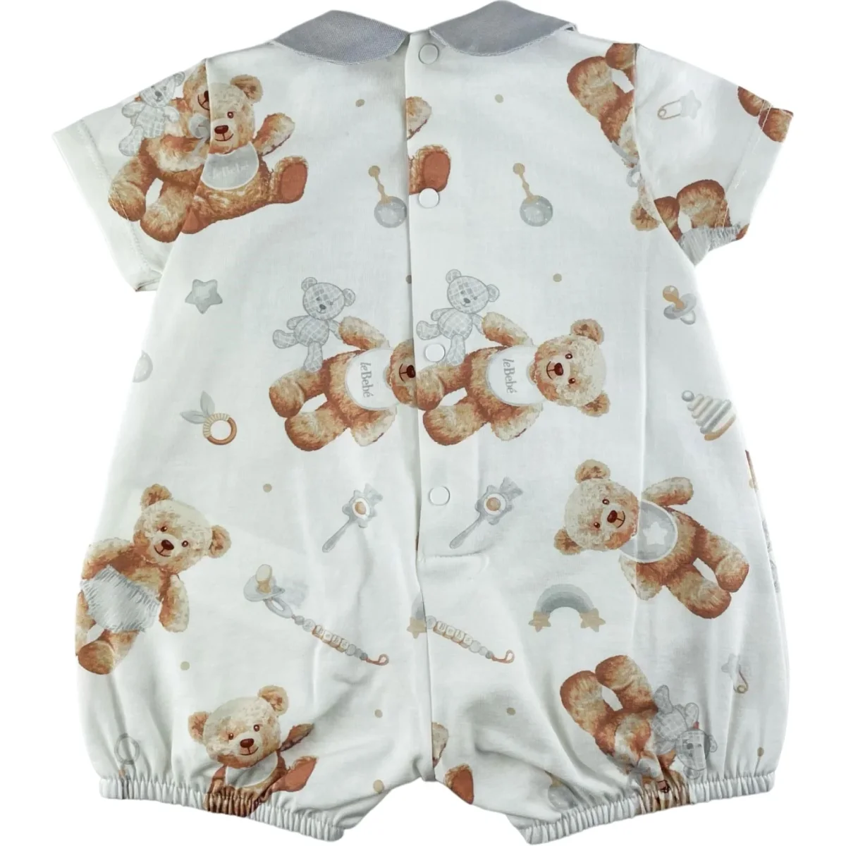 Pagliaccetto LE BEBE’ in cotone a fantasia, chiusura con clips.