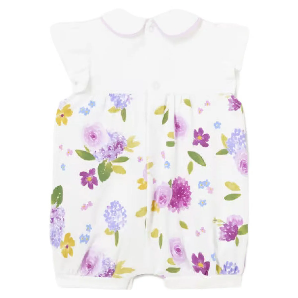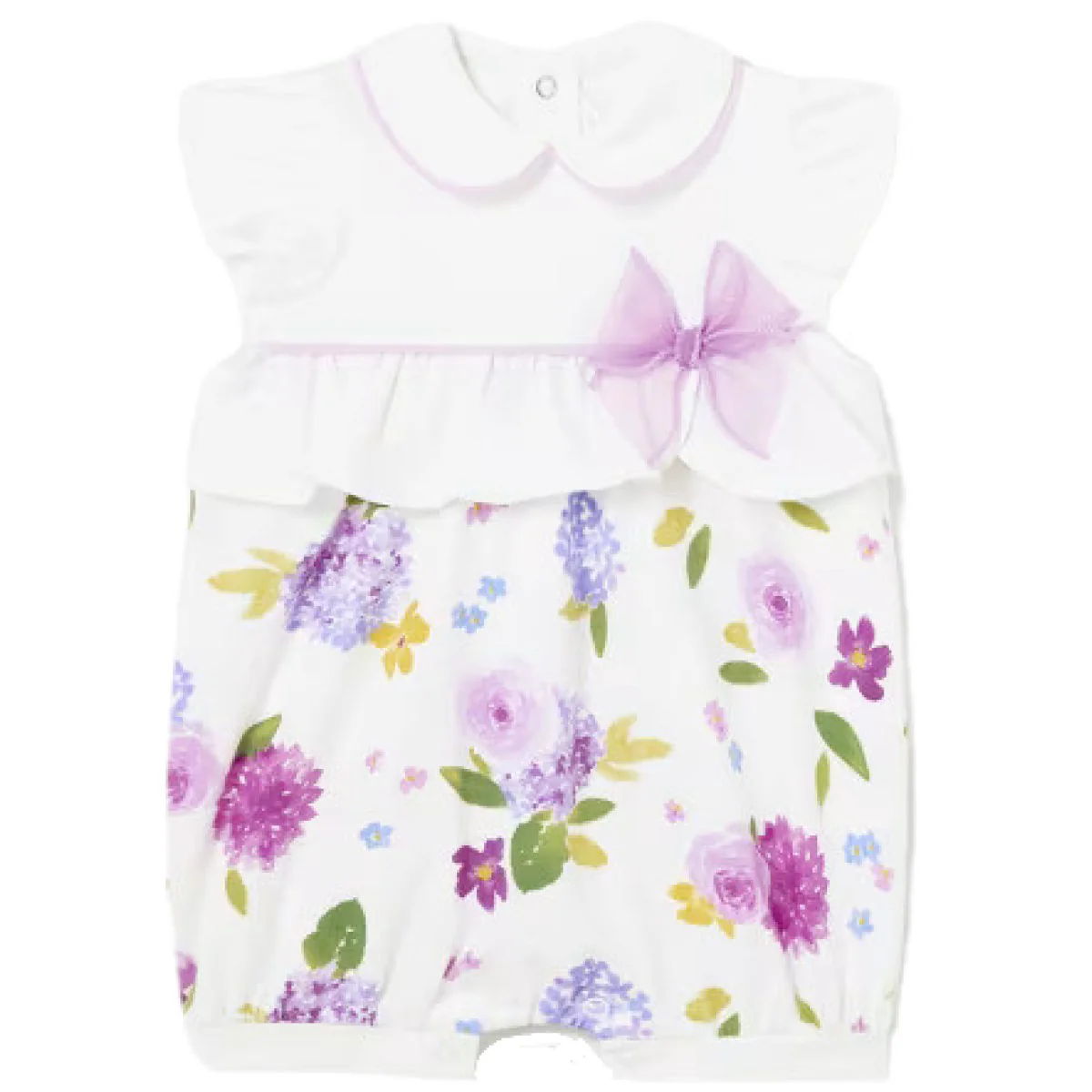 Pagliaccetto MAYORAL in cotone a fantasia floreale, voilant e fiocco in tessuto a contrasto applicati, chiusura con clips.