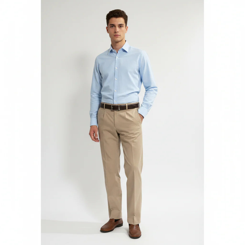 Pantalone uomo straight fit in tessuto mano cotone pesante. Vita alta con pences, cinturino con passanti, chiusura con zip e bottone. Tasche a filo laterali. Gamba e fondo larghi modello palazzo. Vestibilità regolare. Composizione tessuto 63% rayon 37% poliestere.
