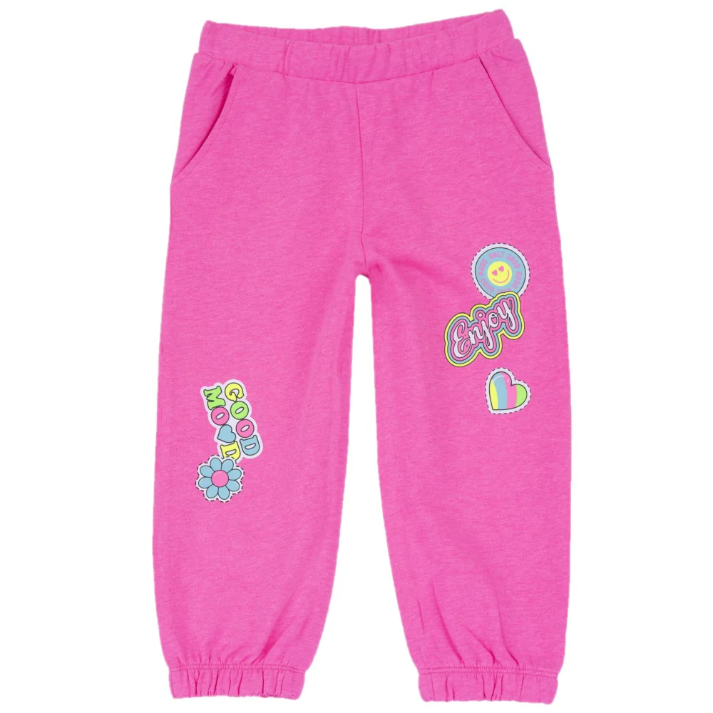Pantalone CHICCO in cotone garzato con stampe multicolor applicate elastico in vita e tasche laterali applicate.