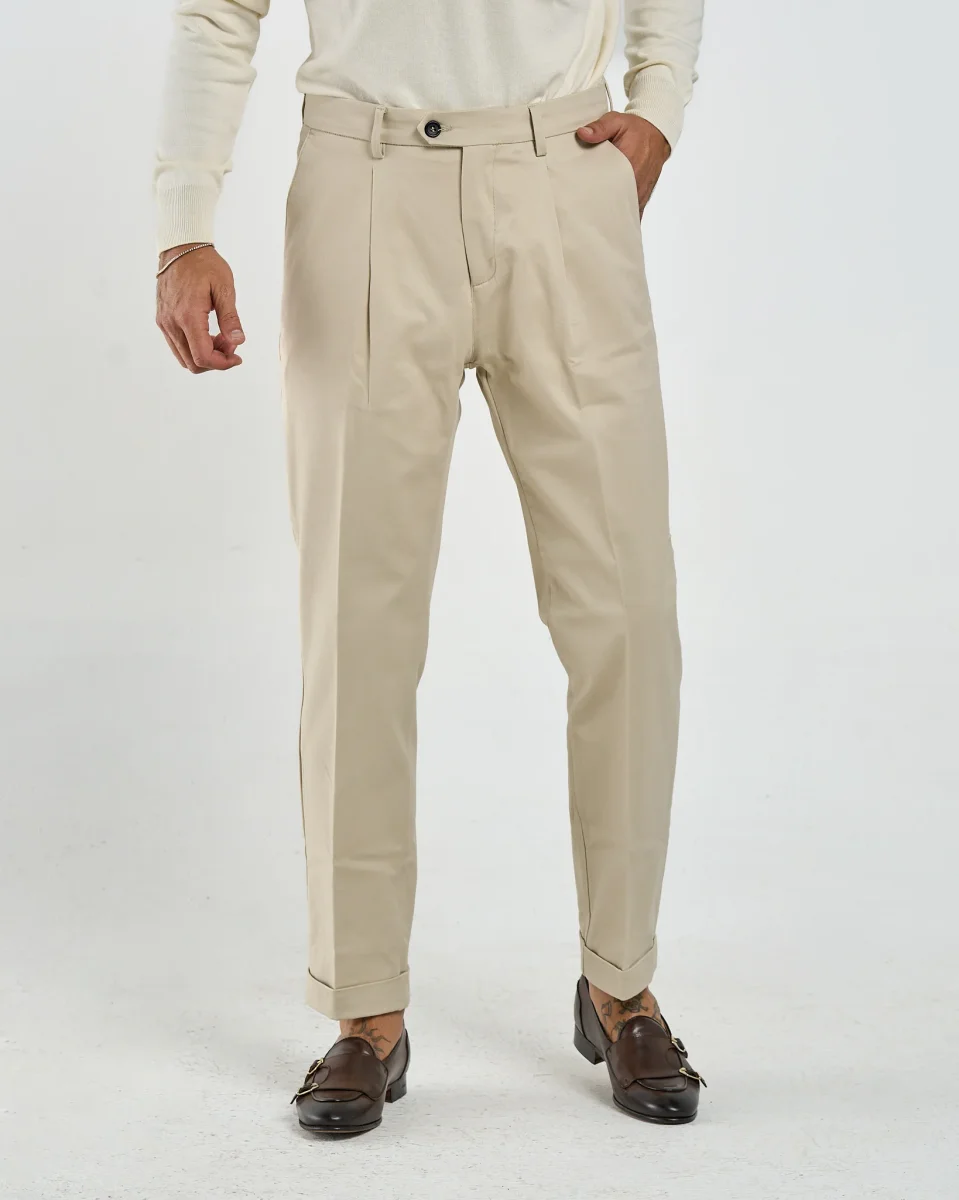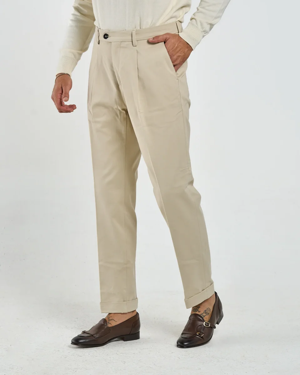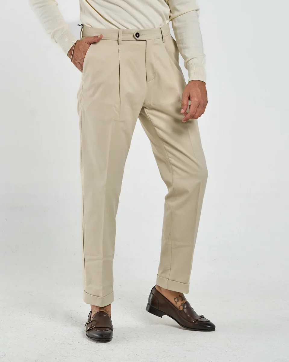 Un pantalone in cotone che unisce lo stile sartoriale alla freschezza quotidiana rendendolo ideale sia per look formali da ufficio che per outfit smart-casual nel tempo libero. Le pinces frontali richiamano l’eleganza classica, la vestibilità è dritta e leggermente affusolata verso il fondo, con risvolto alla caviglia che aggiunge un dettaglio raffinato e contemporaneo.