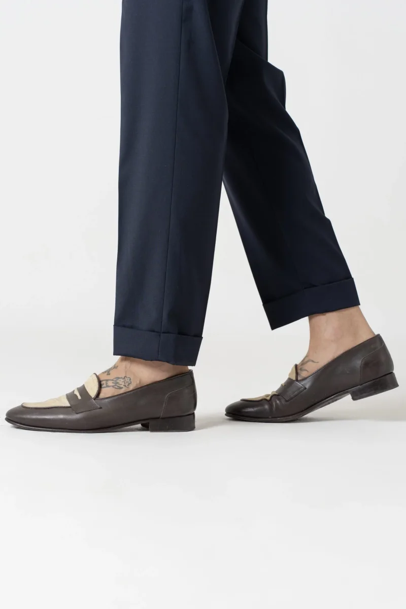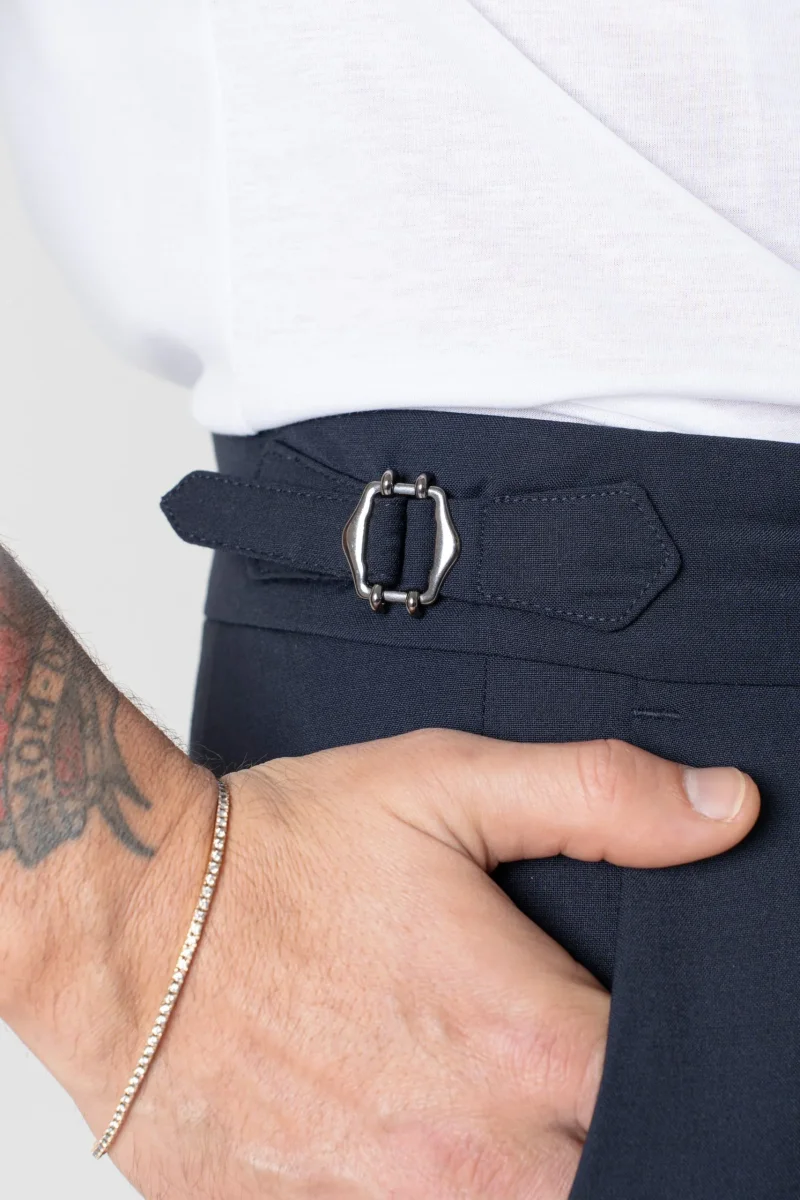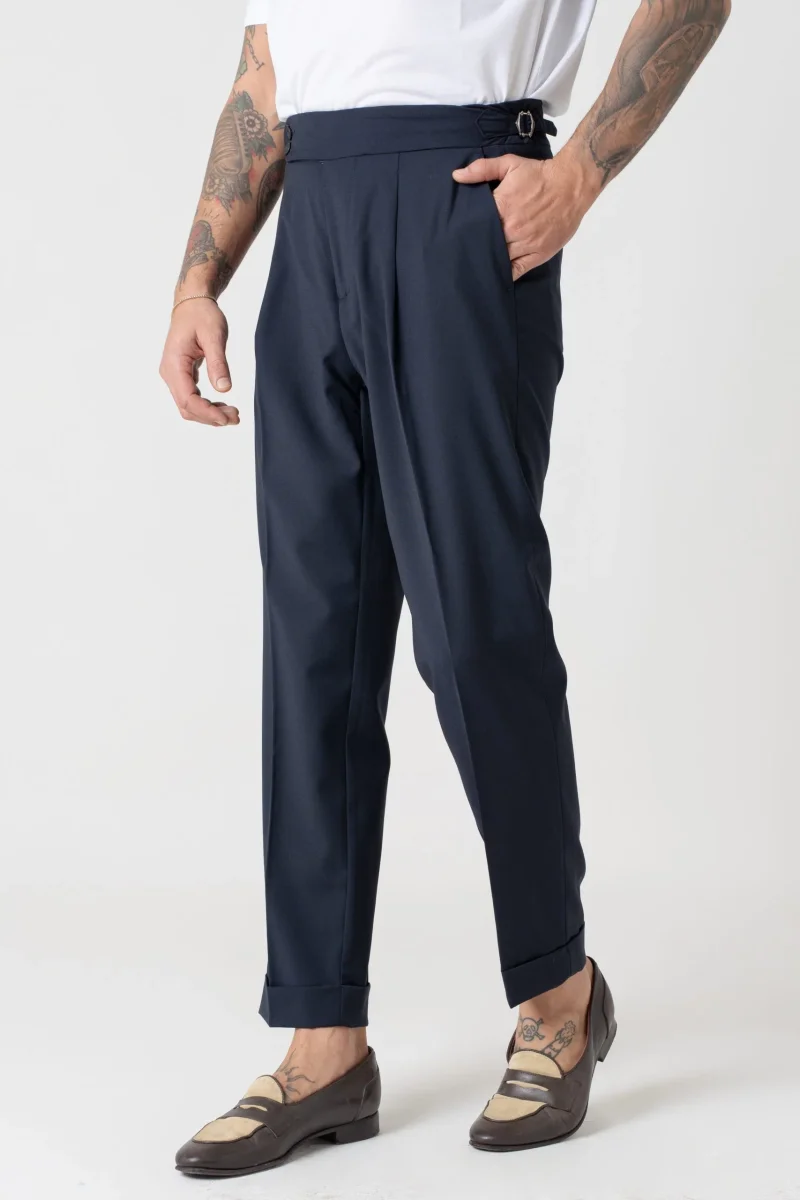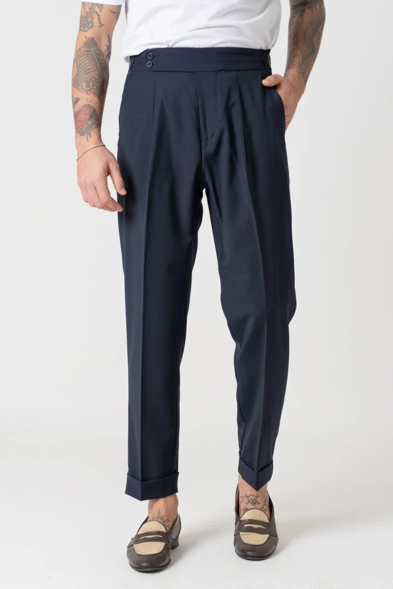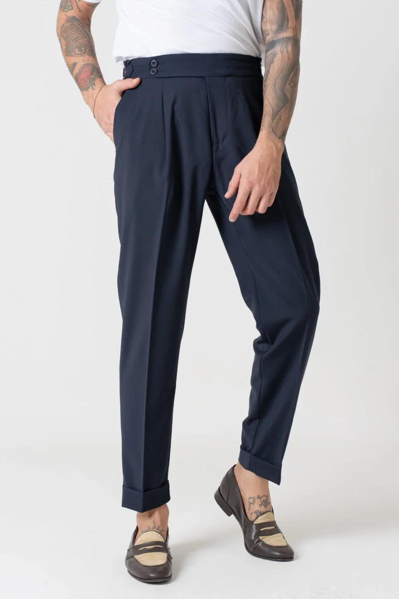 Pantalone vita alta con bustino tondo dotato di doppia abbottonatura e fibbiette regolatori laterali per una vestibilità perfetta, 1 pence frontale che aggiunge struttura e movimento al pantalone.
