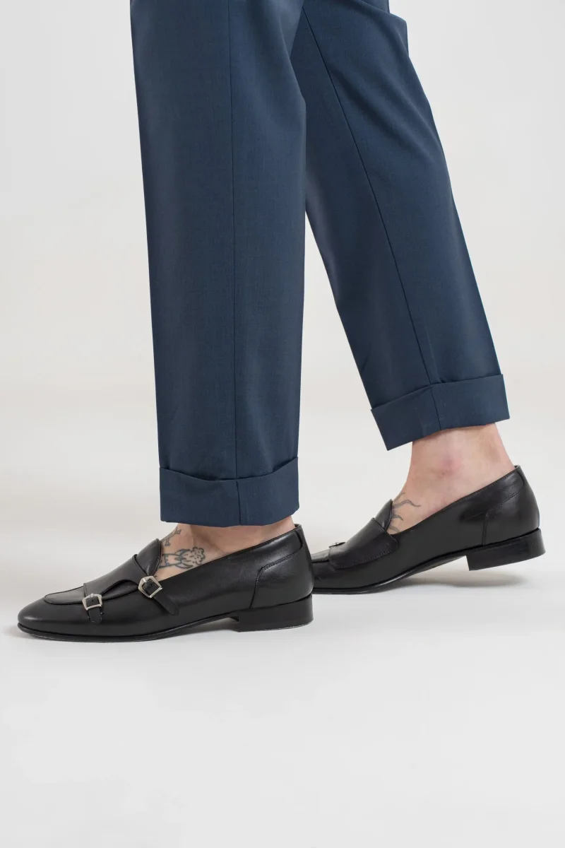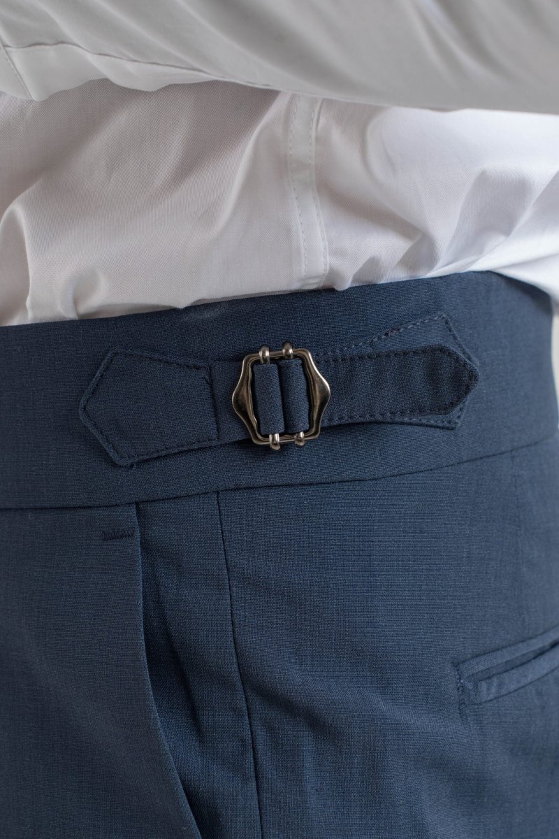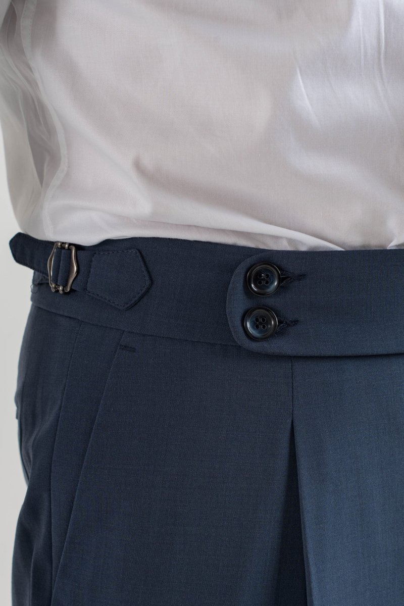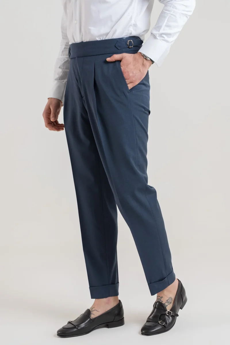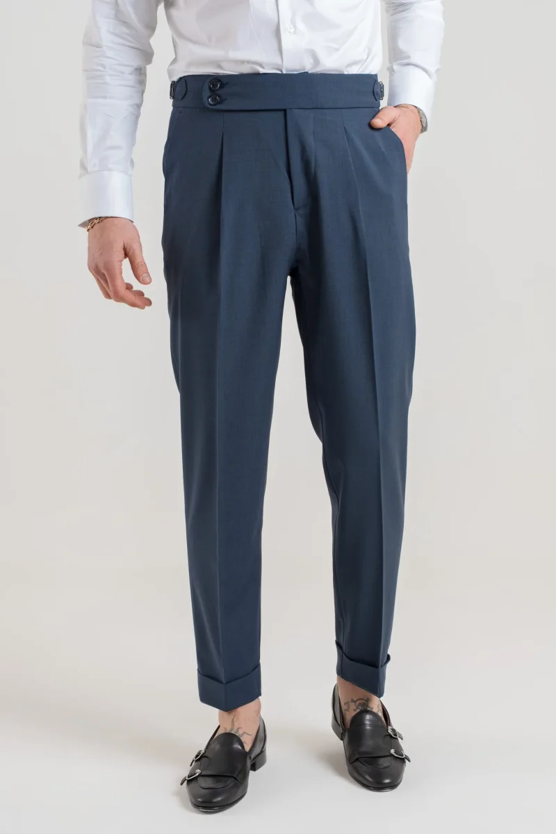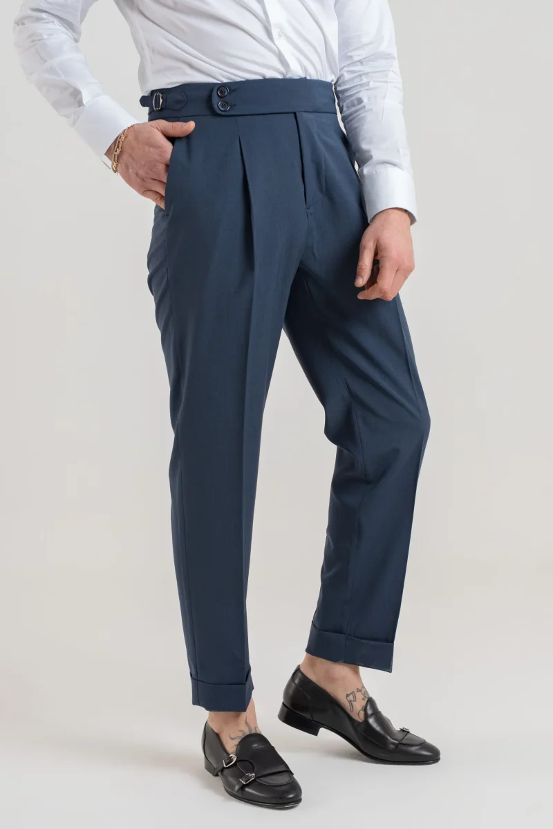 Pantalone vita alta con bustino tondo dotato di doppia abbottonatura e fibbiette regolatori laterali per una vestibilità perfetta, 1 pence frontale che aggiunge struttura e movimento al pantalone.