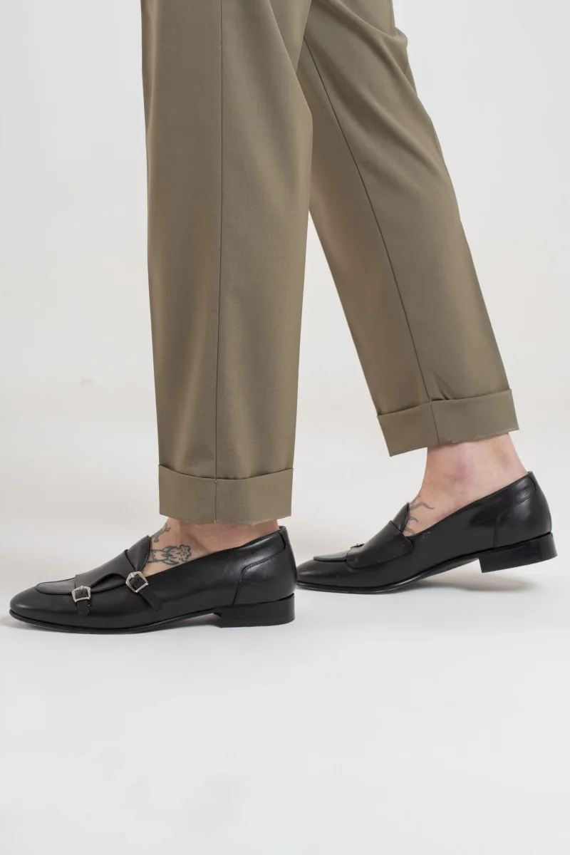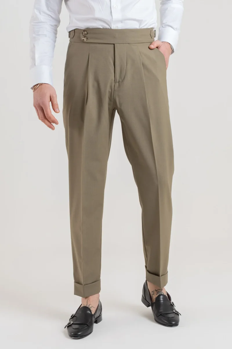Pantalone vita alta con bustino tondo dotato di doppia abbottonatura e fibbiette regolatori laterali per una vestibilità perfetta, 1 pence frontale che aggiunge struttura e movimento al pantalone.