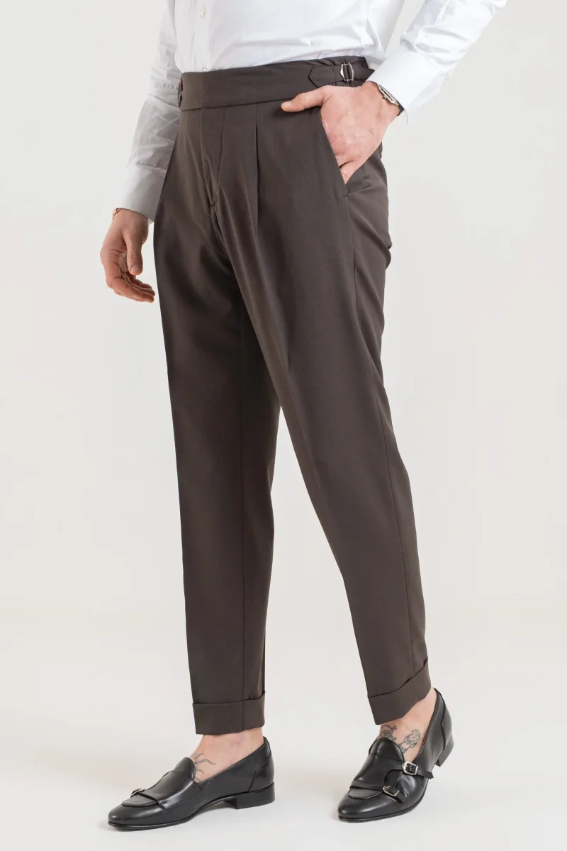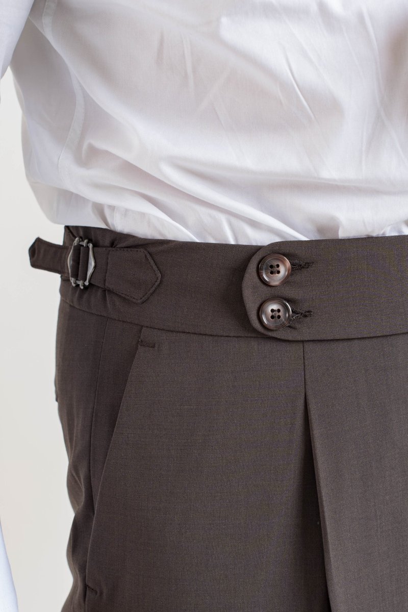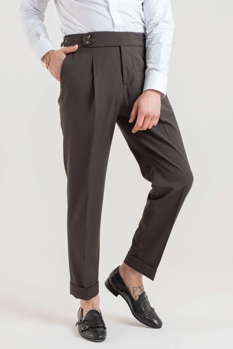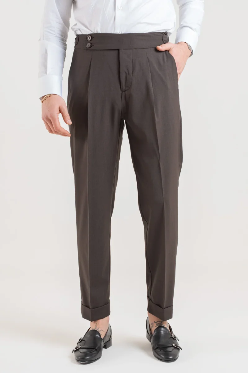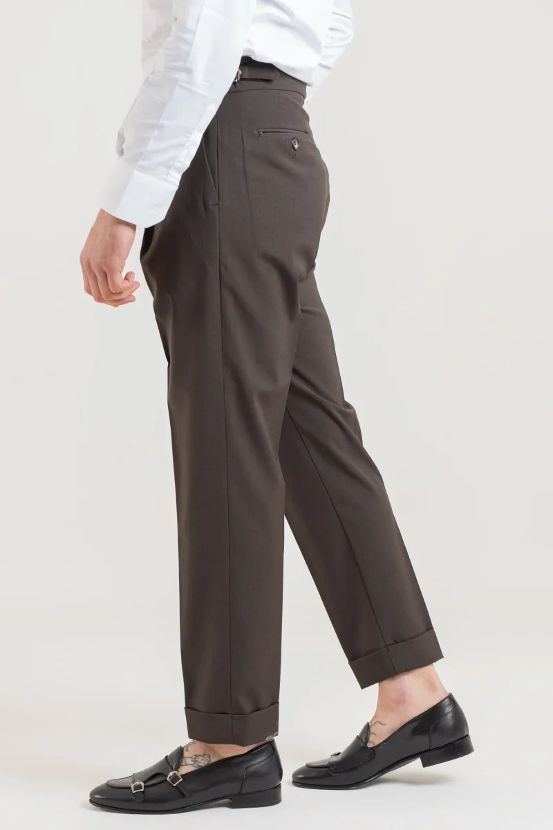 Pantalone vita alta con bustino tondo dotato di doppia abbottonatura e fibbiette regolatori laterali per una vestibilità perfetta, 1 pence frontale che aggiunge struttura e movimento al pantalone.