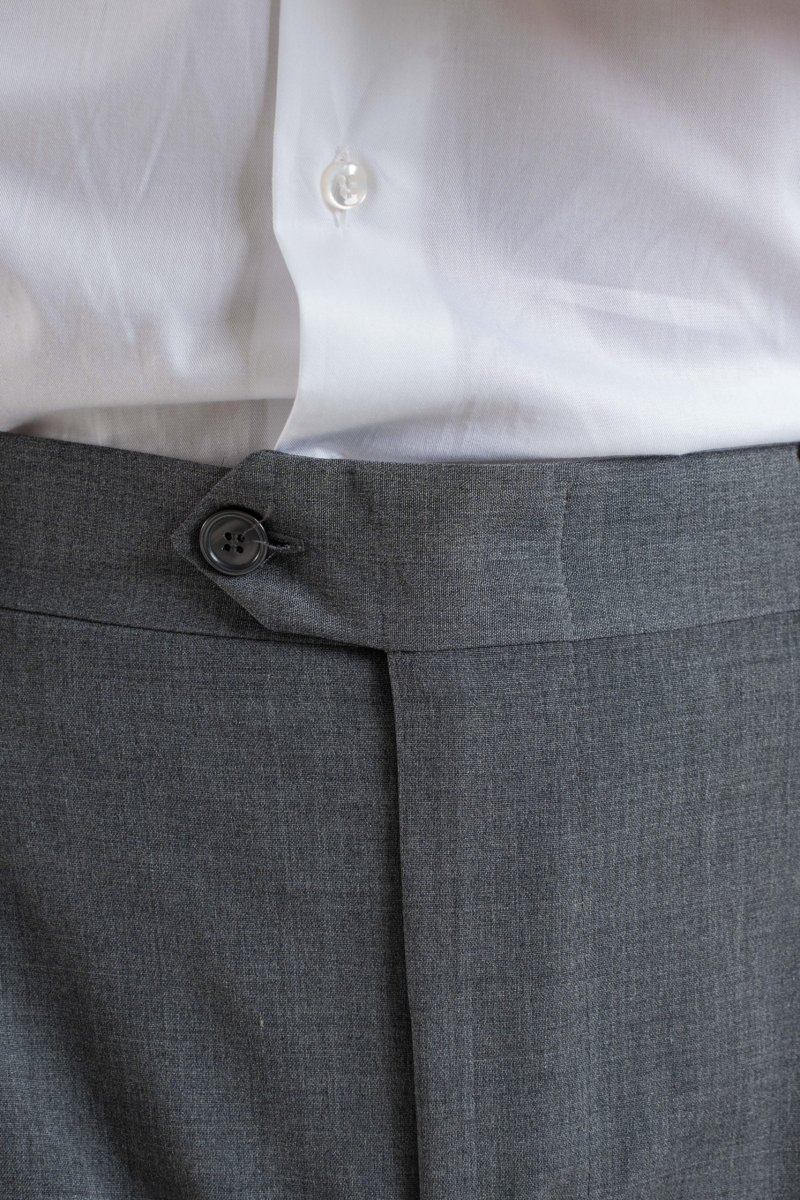 Bustino vita alta con abbottonatura mono-bottone, doppia pence, gamba dritta, fondo largo con piega inglese di 2,5cm.