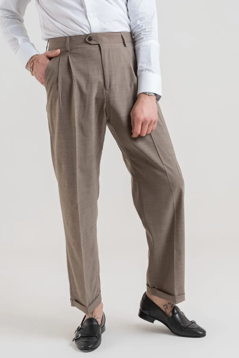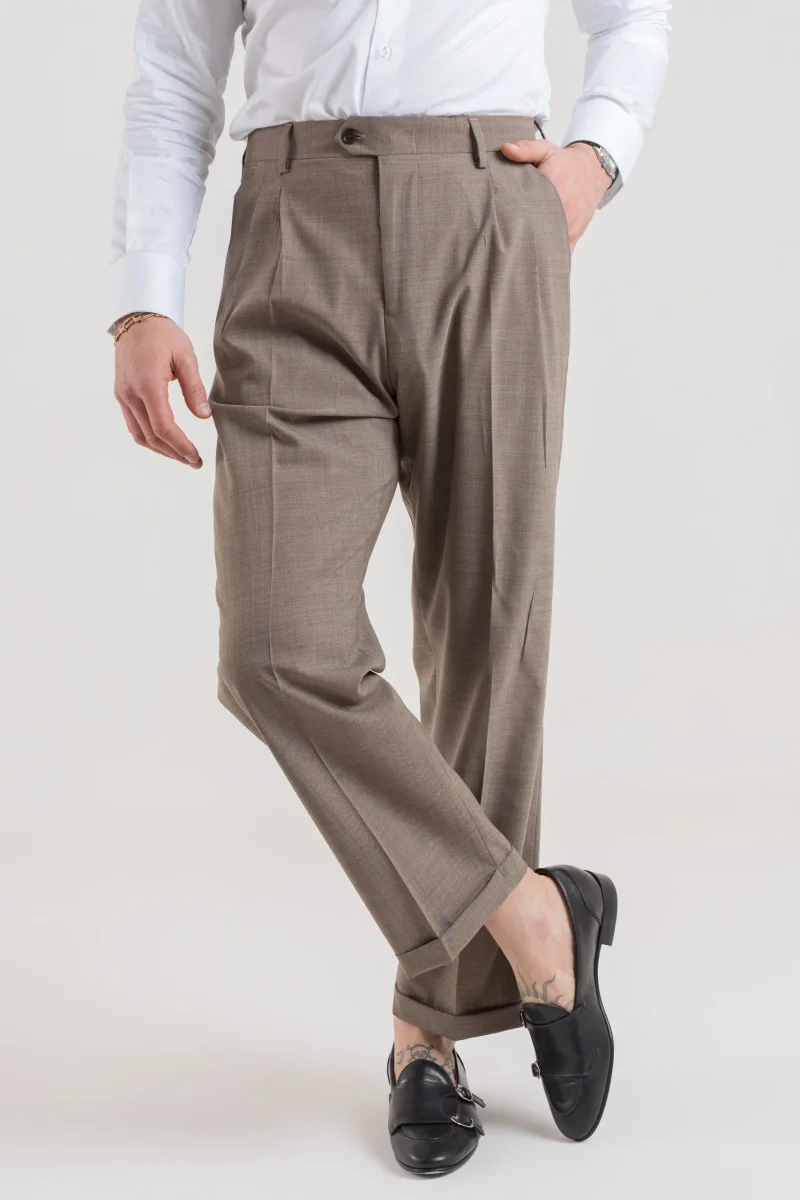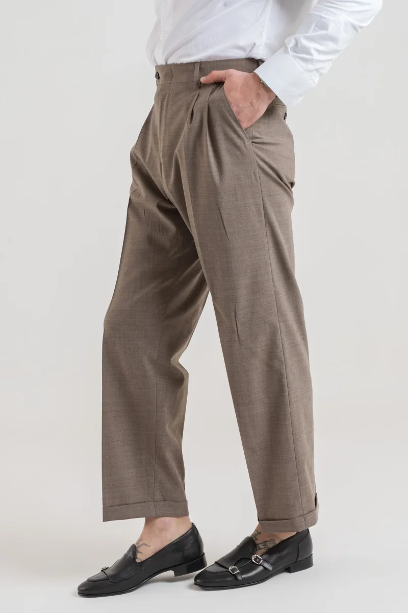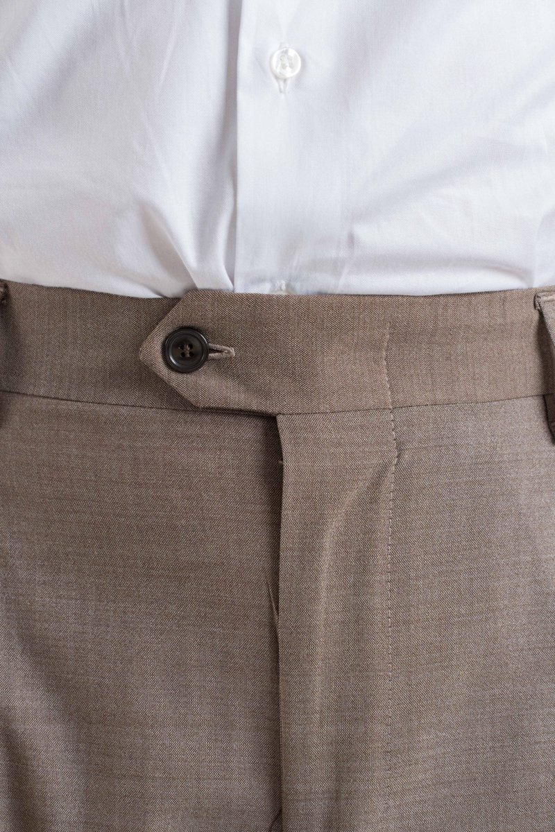 Bustino vita alta con abbottonatura mono-bottone, doppia pence, gamba dritta, fondo largo con piega inglese di 2,5cm.
