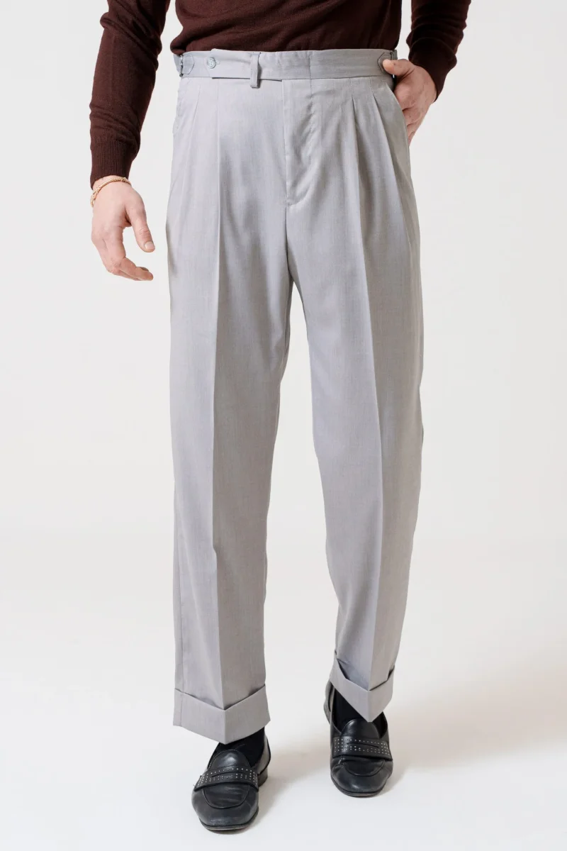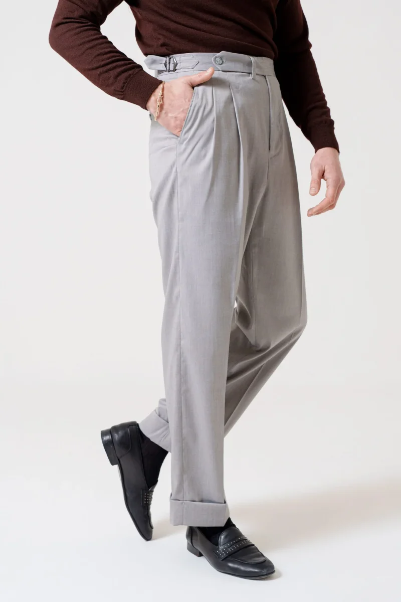 Pantalone Semi-Sartoriale in Fresco Lana – Fondo Ampio, Fibbie Laterali e Risvolto da 5 cm
