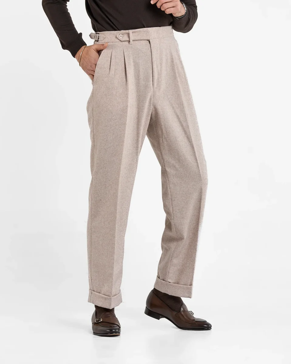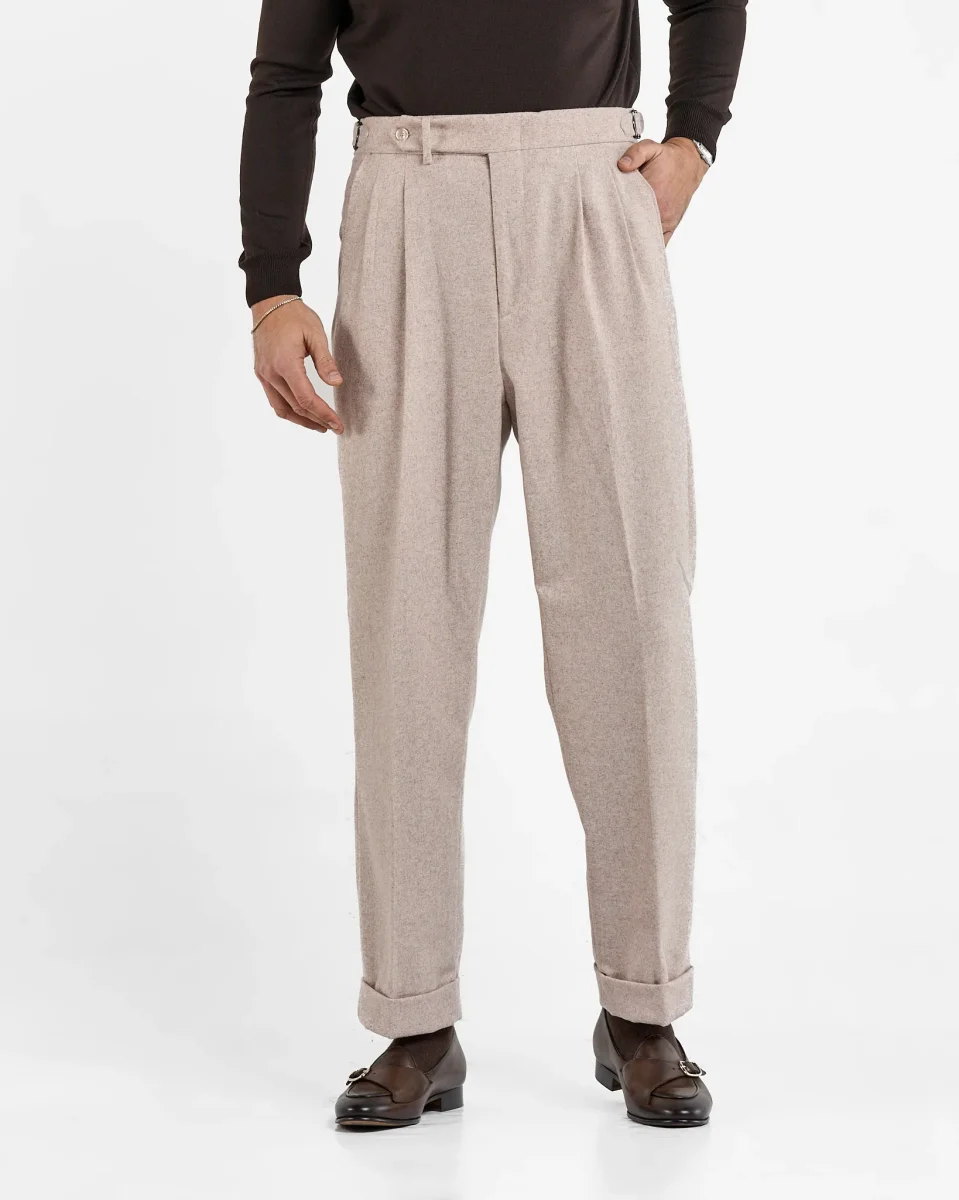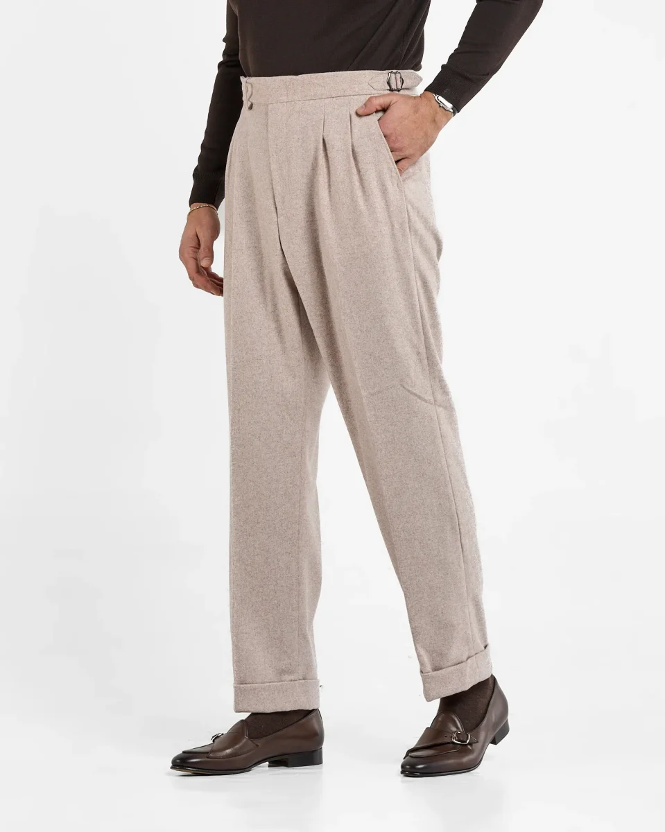 Pantalone Semi-Sartoriale in Fresco Lana – Fondo Ampio, Fibbie Laterali e Risvolto da 5 cm