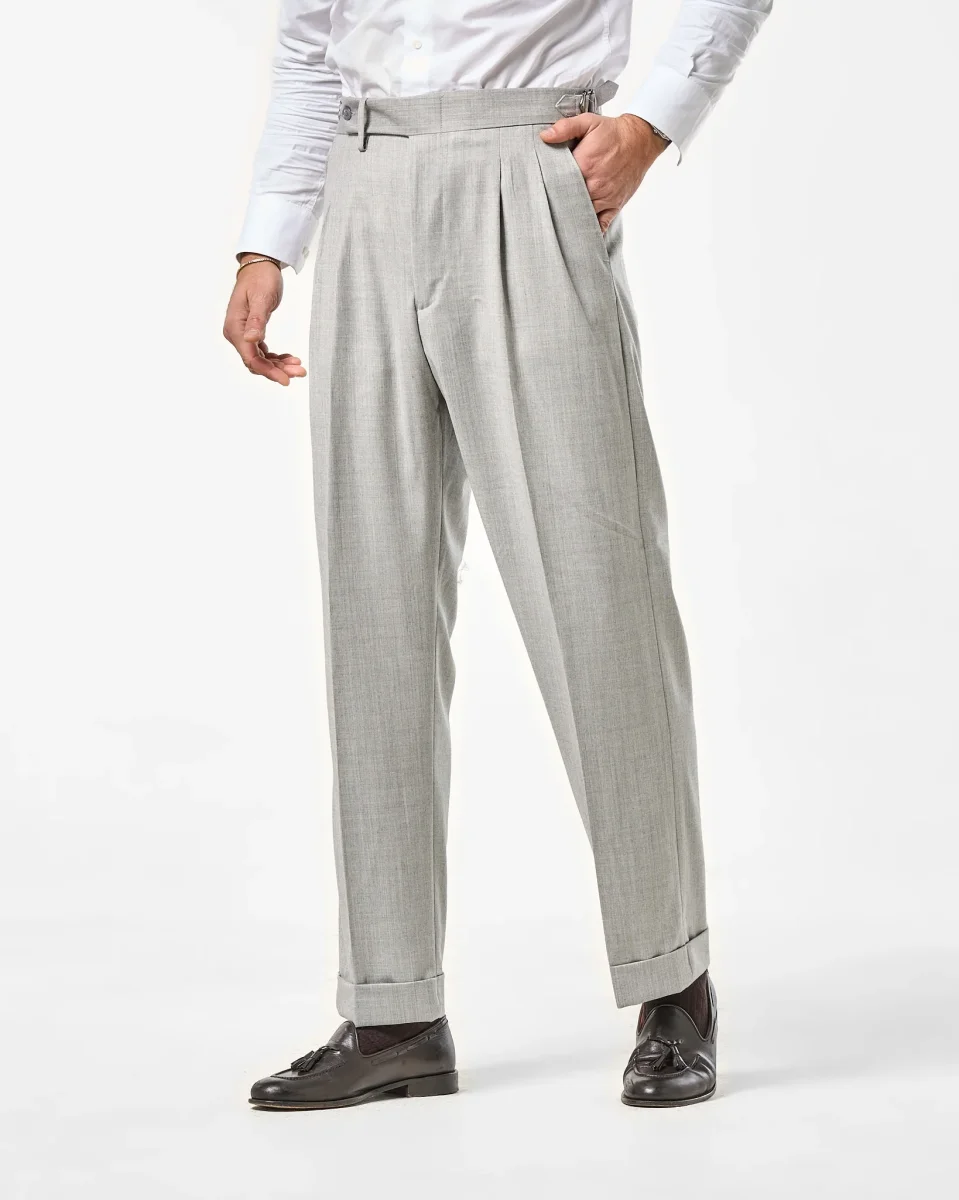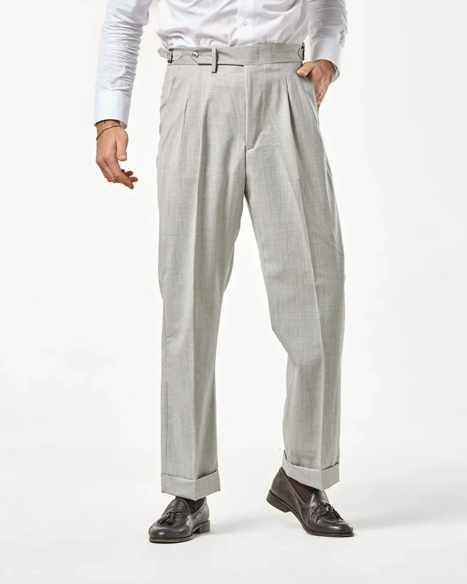 Pantalone Semi-Sartoriale in Fresco Lana – Fondo Ampio, Fibbie Laterali e Risvolto da 5 cm