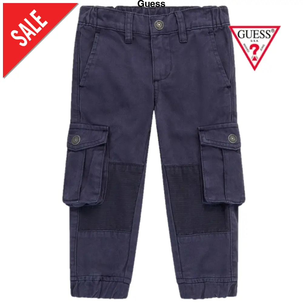 Pantalone GUESS modello cargo con tasconi laterali con chiusura clips logate, elastico in vita con chiusura clips, logo applicato sul retro, elastici alle caviglie.