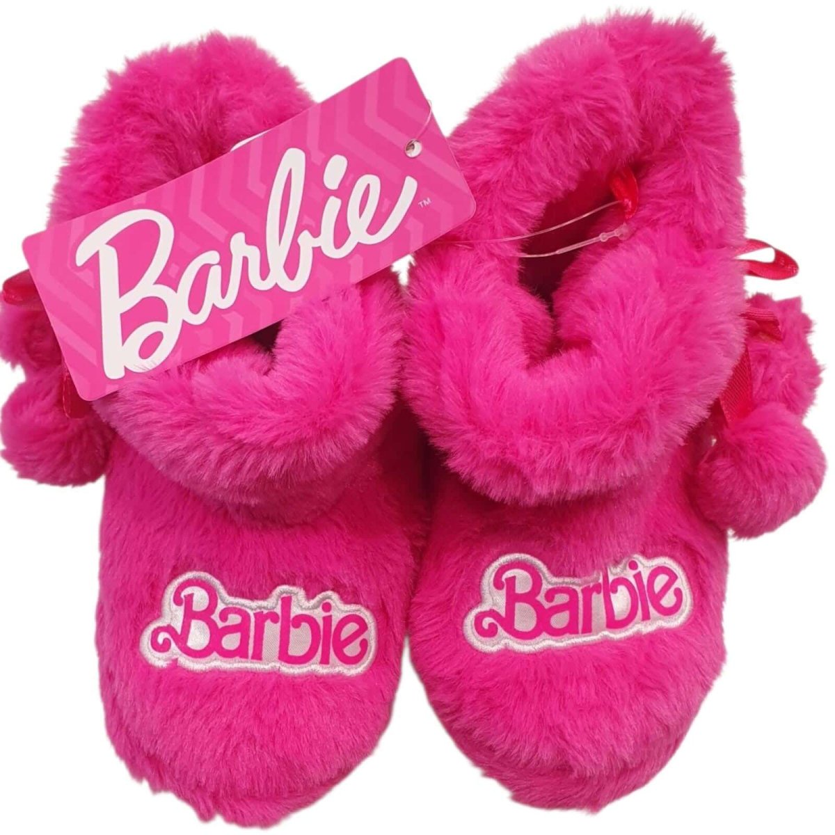 Pantofole BARBIE fuxia a stivaletto in tessuto morbido , con pompon e logo. Fondo in gomma.