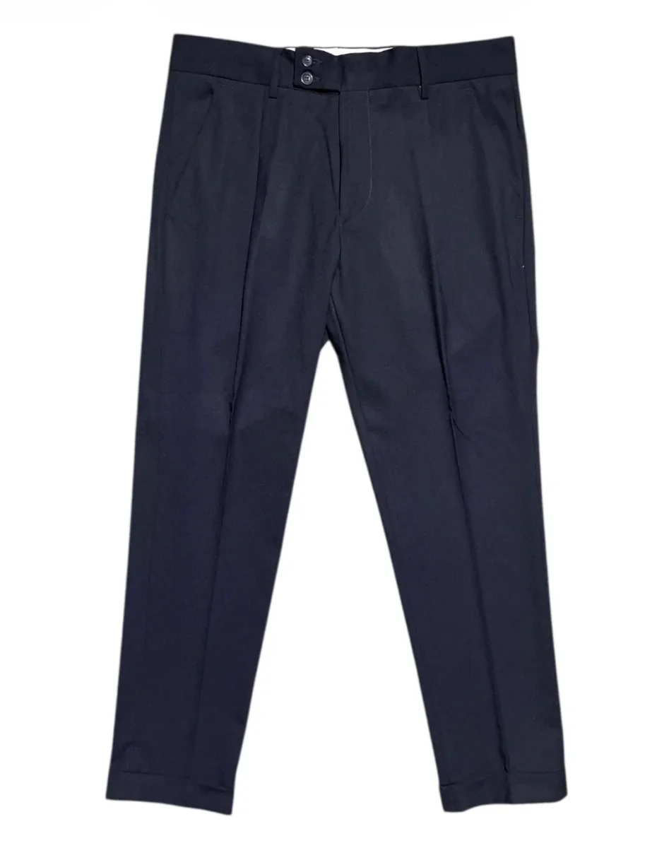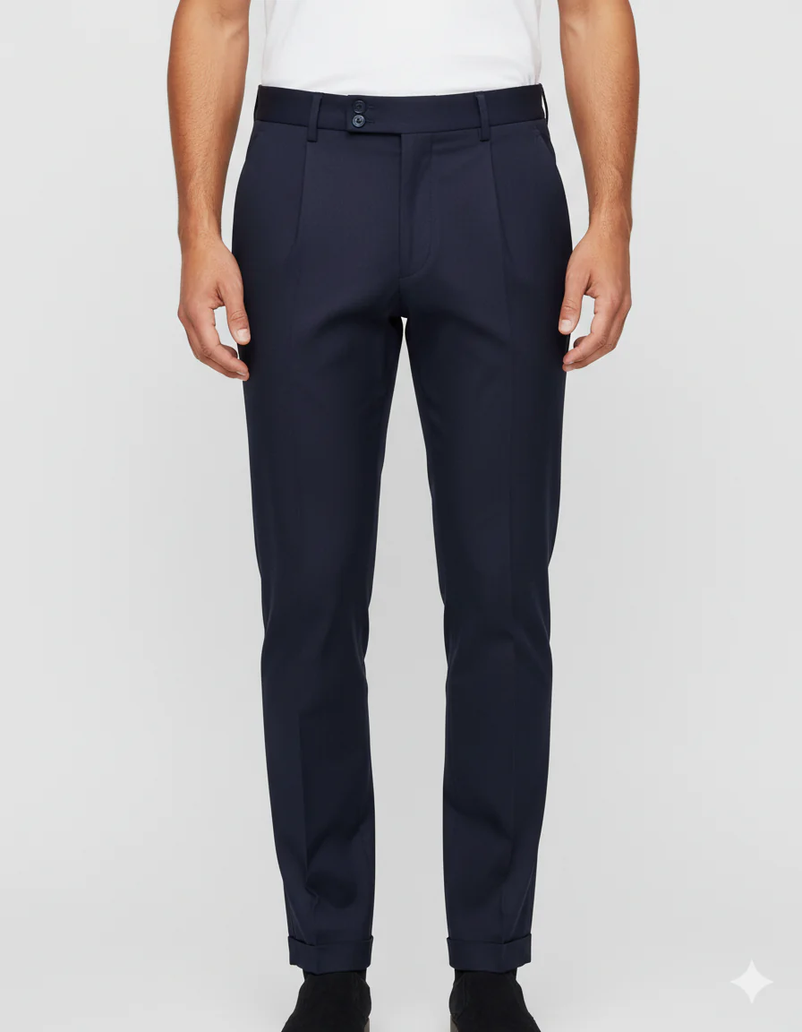 Pantalone in tessuto misto viscosa mano lana. Vita regolare, cinturino fisso con chiusura laterale doppio bottone. Pences in vita. Tasche a filo laterali. Gamba slim e fondo stretto con piega con risvolto. Vestibilità regolare. Crea l’abito con la giacca abbinata. Composizione tessuto 68% poliestere 30% viscosa 2% elastan.