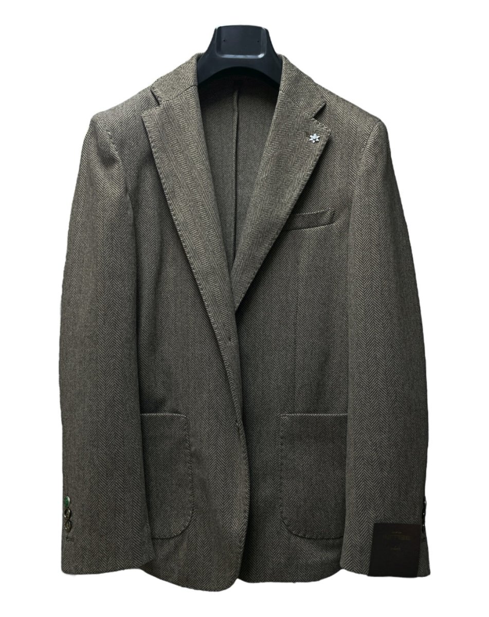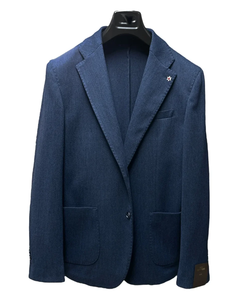 Giacca sfoderata in tessuto misto lana motivo spigato. Collo con revers stretti, chiusura con doppio bottone centrale, tasche a toppa applicate. Vestibilità slim. Composizione tessuto 70% poliestere 27% lana 3% elastan.