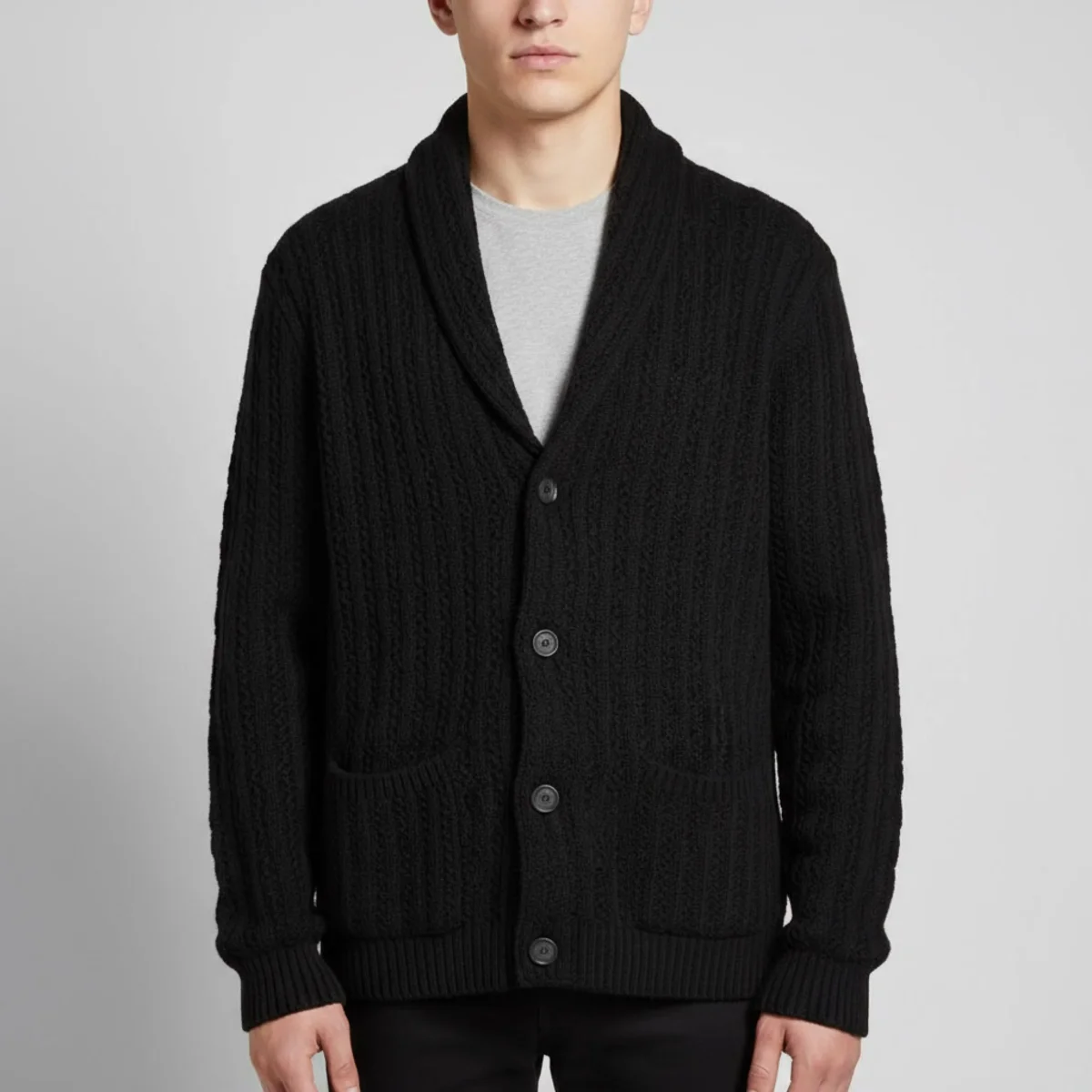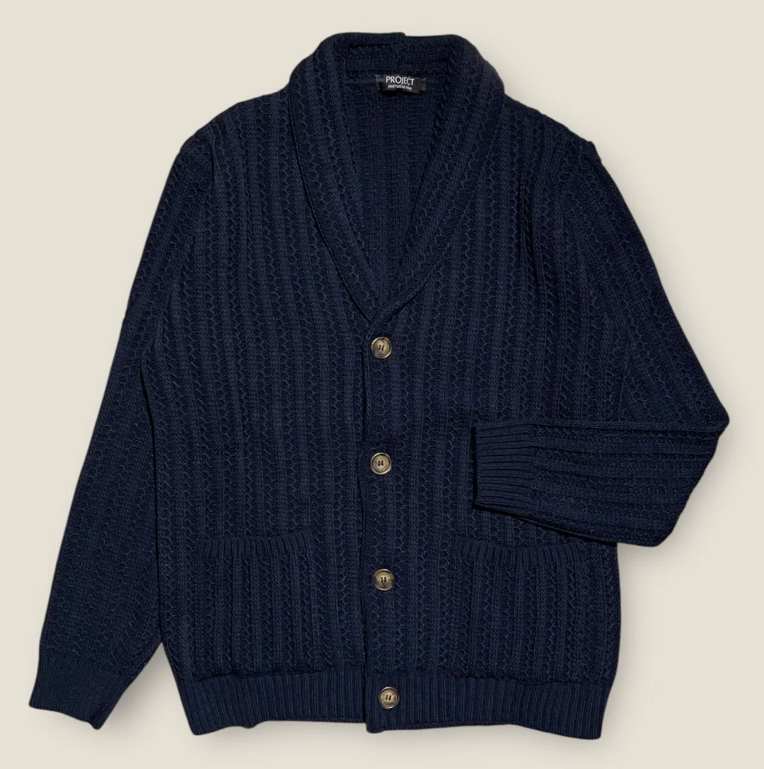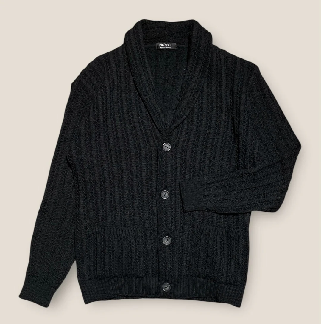 Cardigan uomo modello giacca in tessuto lavorato a maglia grossa misto lana. Collo sciallato, chiusura con bottoni centrali in tinta. Tasche quadrate applicate. Tessuto lavorato con intrecci. Vestibilità regolare. Composizione tessuto 70% acrilico 30% lana.