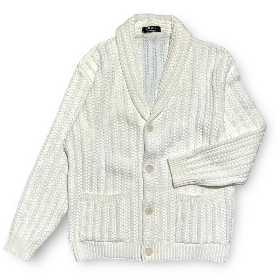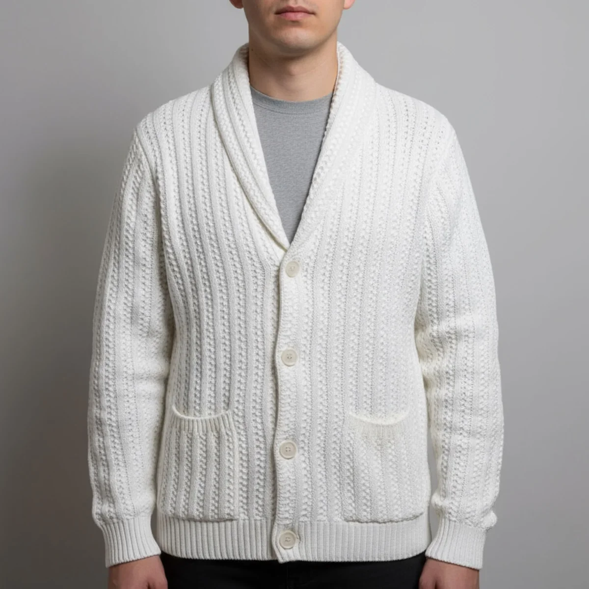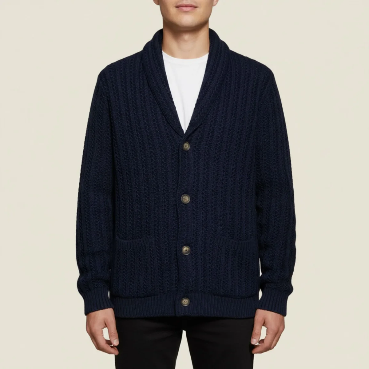 Cardigan uomo modello giacca in tessuto lavorato a maglia grossa misto lana. Collo sciallato, chiusura con bottoni centrali in tinta. Tasche quadrate applicate. Tessuto lavorato con intrecci. Vestibilità regolare. Composizione tessuto 70% acrilico 30% lana.