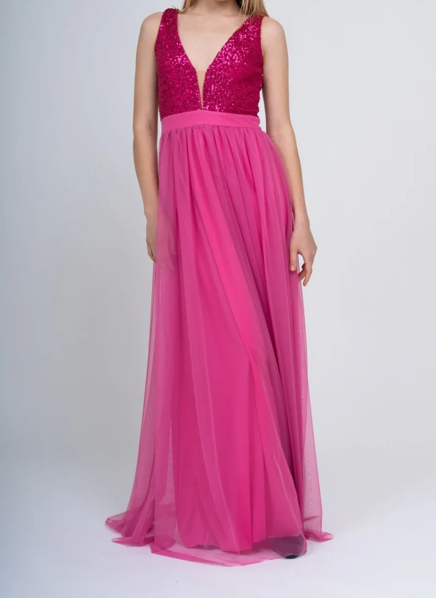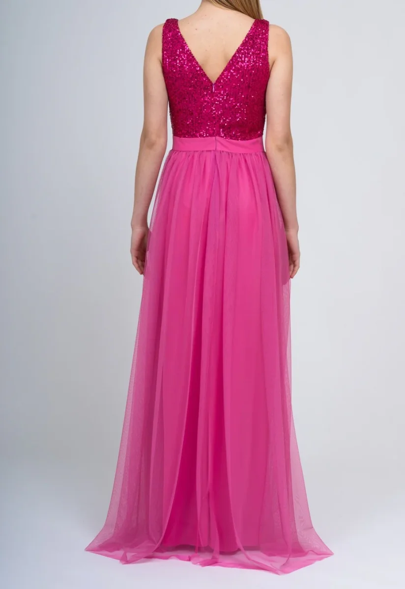 Vestito lungo elegante da cerimonia doppio tessuto. Corpetto interamente rivestito di paillettes, scollo a V con inserto in garzina. Fascia in vita, chiusura con zip invisibile sulla schiena. Gonna lunga in tulle con fodera in tessuto elasticizzato. Vestibilità regolare, taglia in foto 42. Composizione tessuto 95% poliestere 5% spandex.