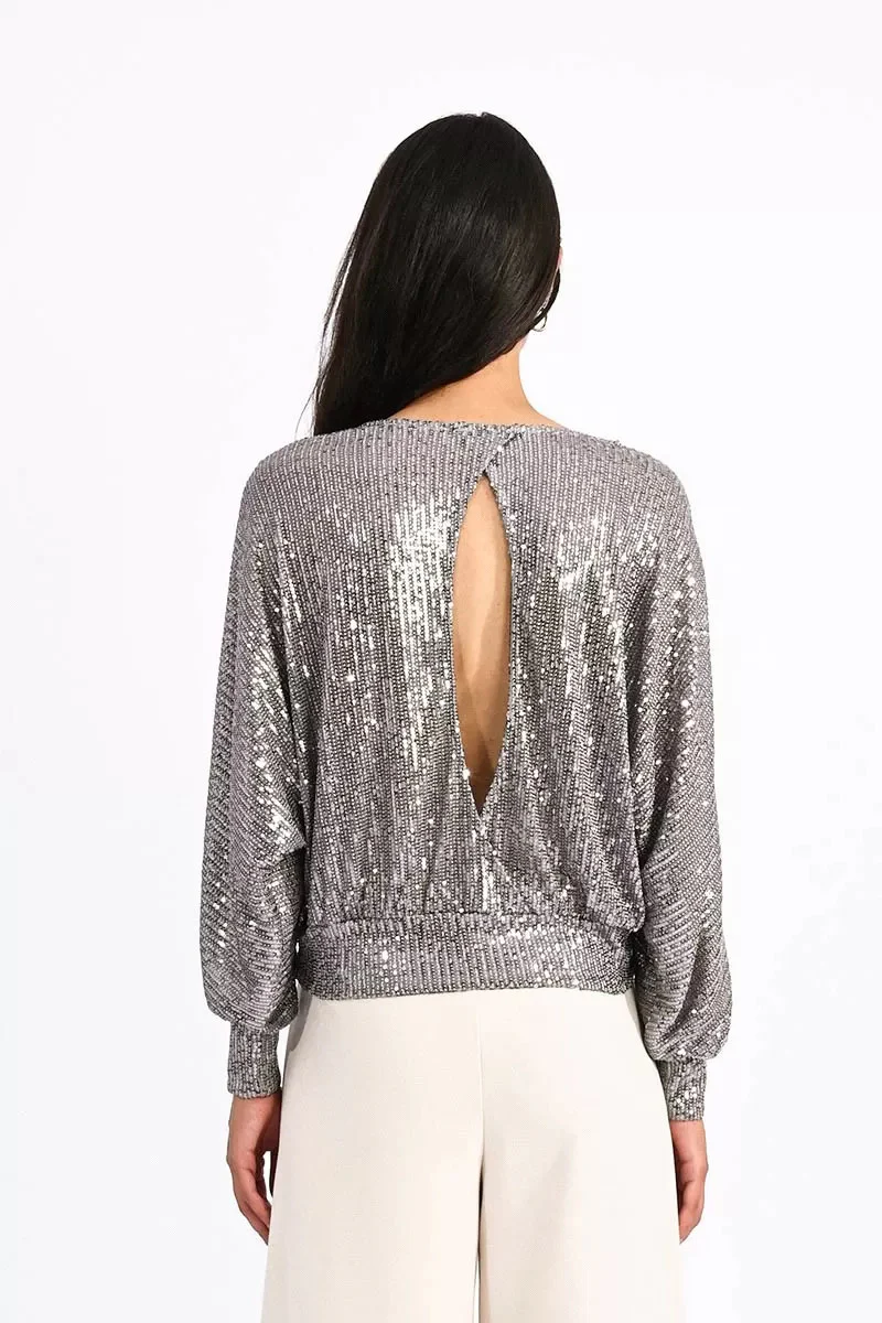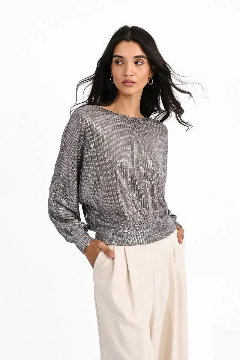 Maglia interamente rivestita di paillettes. Girocollo regolare con goccia e chiusura con bottone sulla schiena. Maniche lunghe a pipistrello, fondo a palloncino con polsini elasticizzati. Vestibilit� comoda. Taglia in foto S. Composizione tessuto 90% poliestere 10% elastan.
