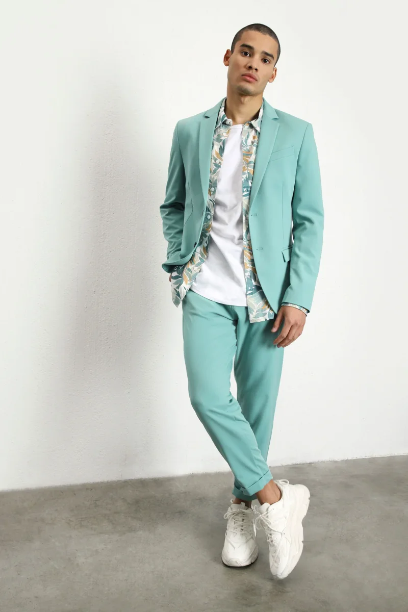 Pantaloni slim-fit tinta unita. Vita regolare con passanti e bottone, tasche america e fondo con risvolto stretto. Il modello indossa la taglia 48. Tessuto 72% poliestere 23% viscosa 5% elastan.