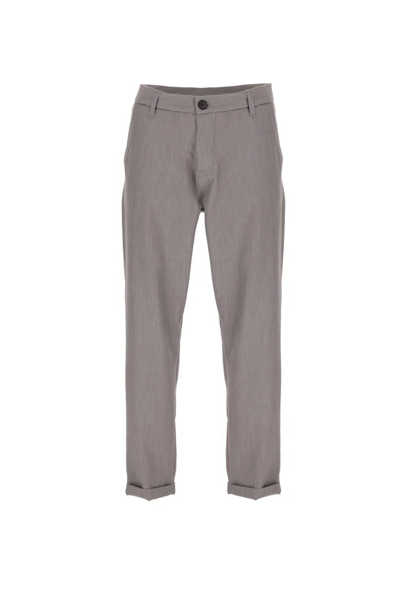 Pantaloni slim-fit tinta unita. Vita regolare con passanti e bottone, tasche america e fondo con risvolto stretto. Il modello indossa la taglia 48. Tessuto 72% poliestere 23% viscosa 5% elastan.
