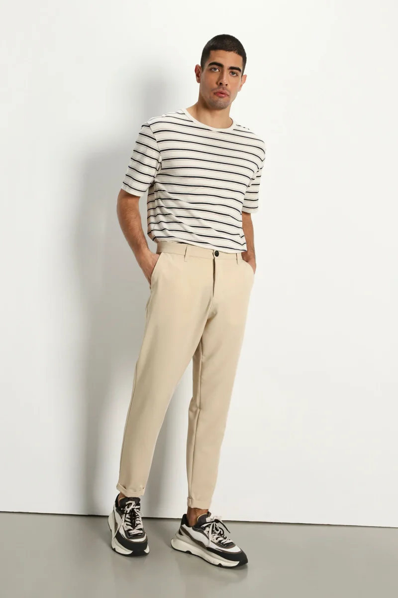 Pantaloni slim-fit tinta unita. Vita regolare con passanti e bottone, tasche america e fondo con risvolto stretto. Il modello indossa la taglia 48. Tessuto 72% poliestere 23% viscosa 5% elastan.