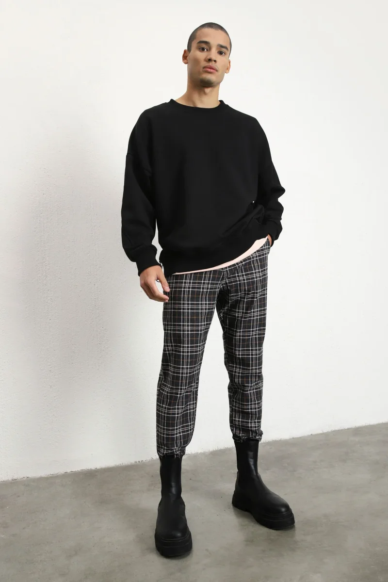 Pantaloni slim-fit fantasia quadroni. Vita regolare, tasche a filo laterali e tasche a filetto posteriori. Il modello indossa la taglia 46. Tessuto 69% cotone, 23% poliestere, 3% poliammide, 5% altre fibre.