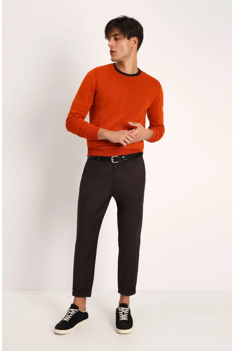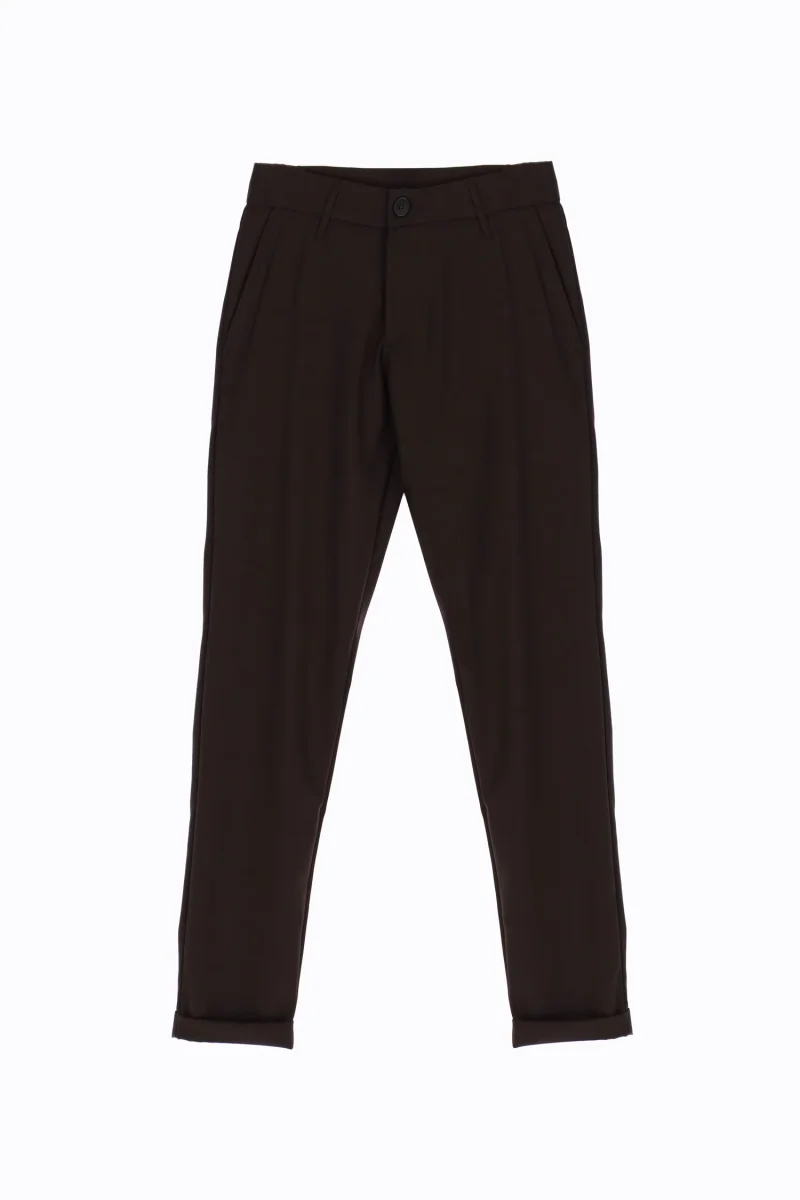 Uno dei nostri modelli pi� venduti. Pantalone modello chino in tessuto tecnico misto viscosa. Vita regolare con cinturino fisso con passanti, chiusura con zip e bottone. Tasche america laterali, tasche a filetto posteriori. Gamba slim e fondo stretto con risvolto. Taglia in foto 46. Composizione tessuto 66 % poliestere, 31 % viscosa, 3 % elastan. Completa il look con la giacca abbinata.