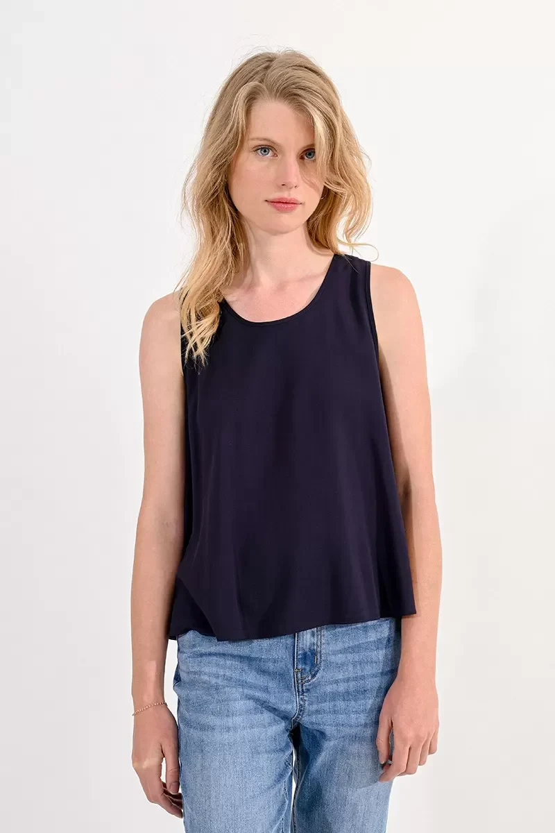 Top basico in tessuto fluido. Scollo tondo con bretelle larghe, corpo a trapezio. Comodo da utilizzare da solo o come sottogiacca. Vestibilità regolare. Taglia in foto S. Composizione tessuto 70% viscosa 30% lyocell.
