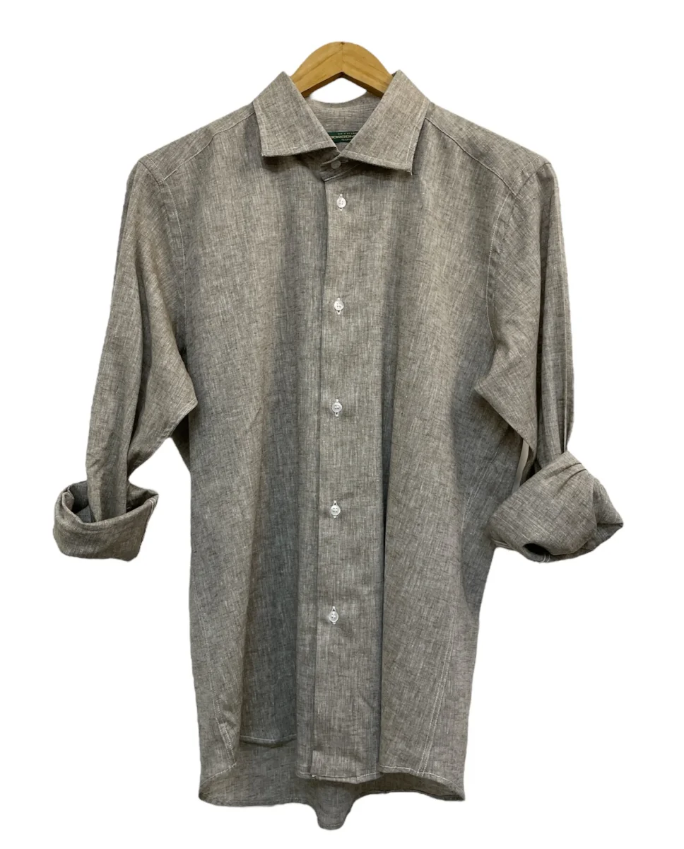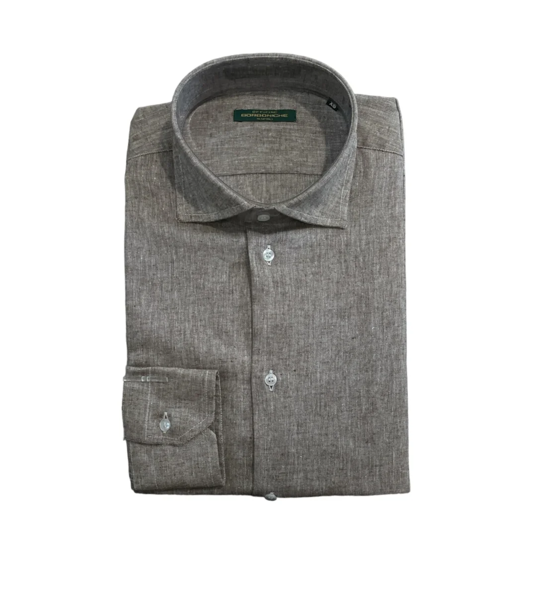 Camicia in tessuto 100% lino. Colletto piccolo, chiusura con bottoni in tinta. Maniche lunghe con polsini chiusi da bottoni. Tessuto lavorato mèlange. Vestibilità comoda, non slim.