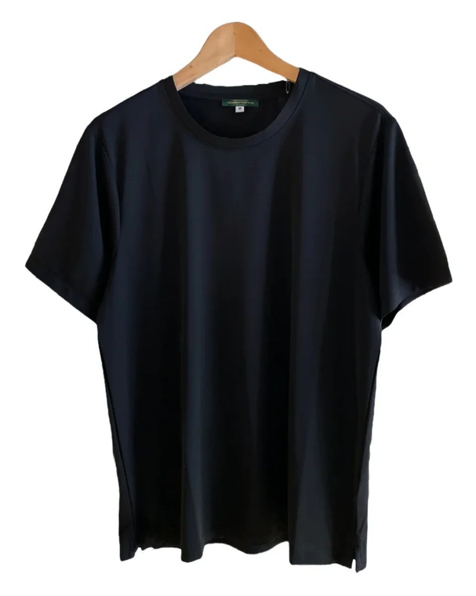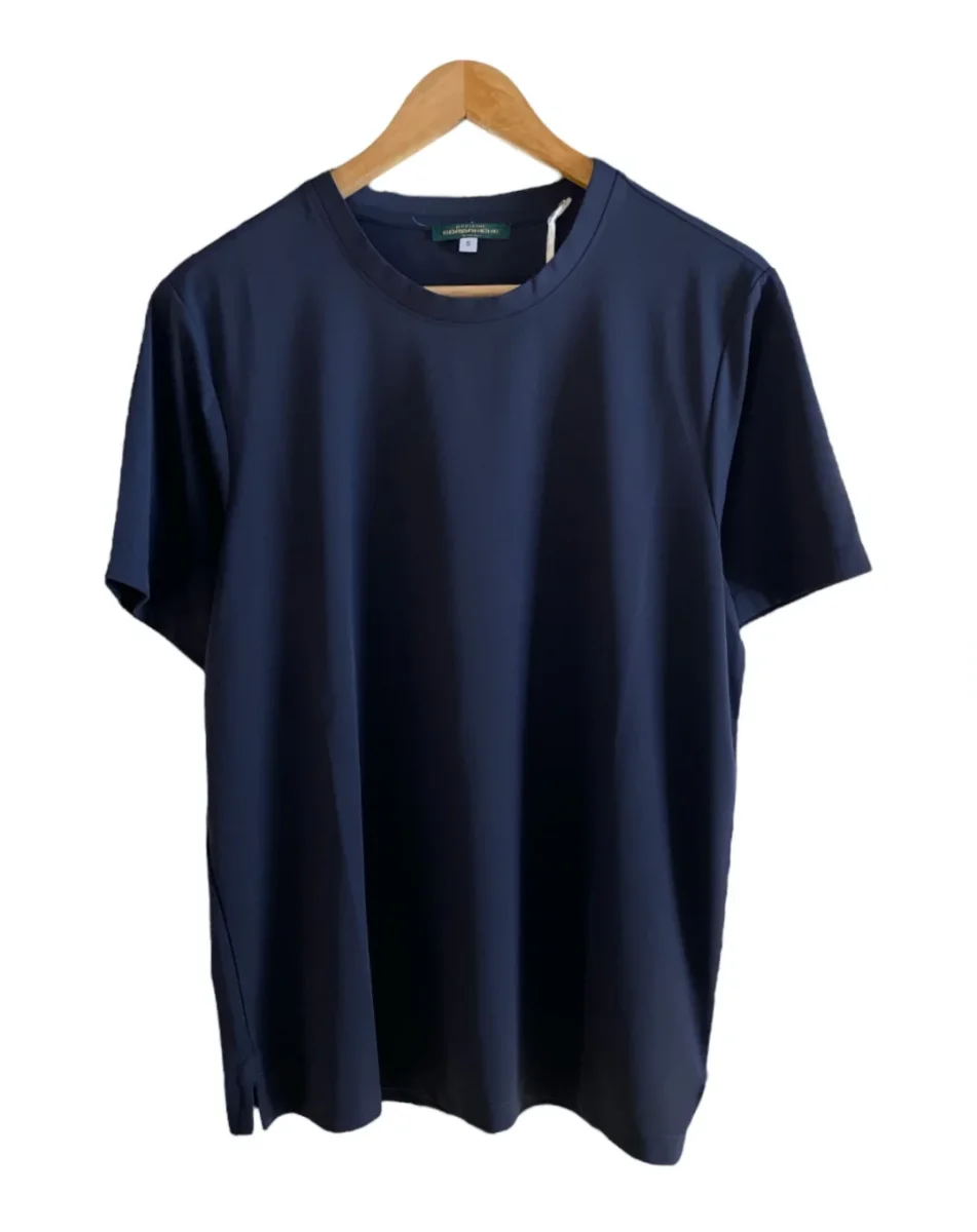 T-shirt in tessuto tecnico ultra leggero lavorato. Girocollo regolare, maniche corte. Vestibilità regolare, doppio spacchetto sul fondo. Composizione tessuto 86% poliammide 14% elastan.