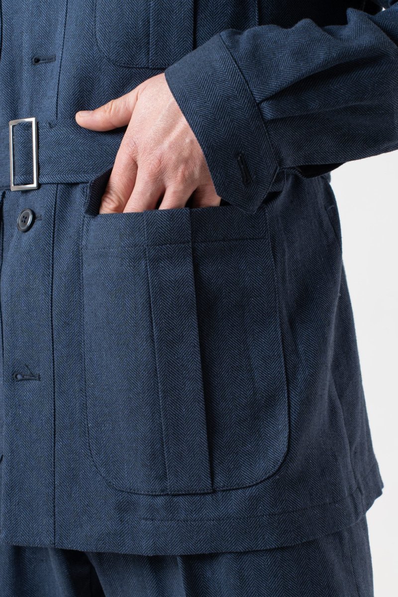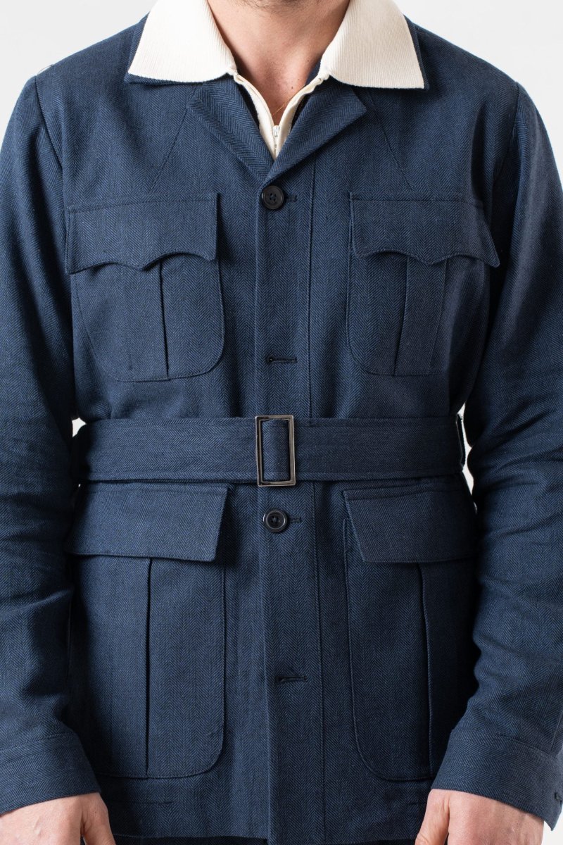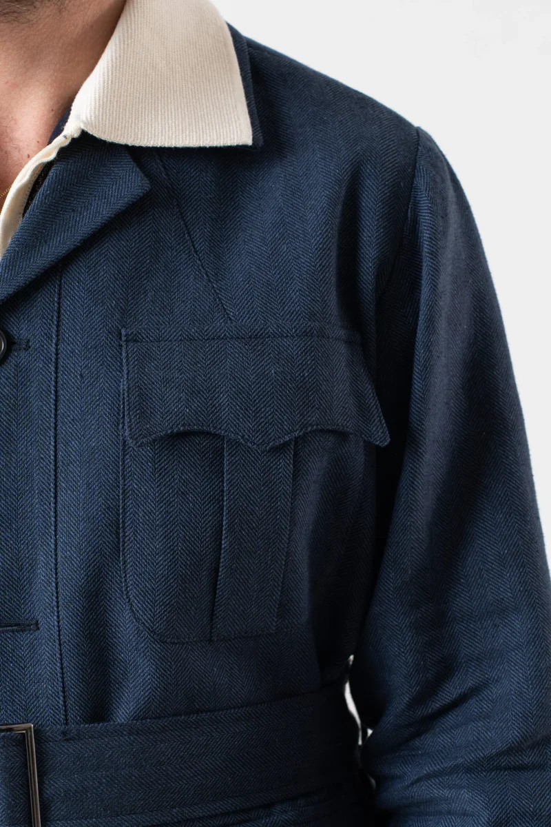 Questa sahariana è il perfetto equilibrio tra raffinatezza e praticità. La trama spigata offre un look senza tempo, senza tralasciare la modernità. La cintura in vita permette di personalizzare la vestibilità donando una silhouette più definita senza sacrificare la comodità. Dotata di tasche frontali con patta, questa giacca è l’ideale per chi cerca la praticità senza rinunciare all’eleganza.