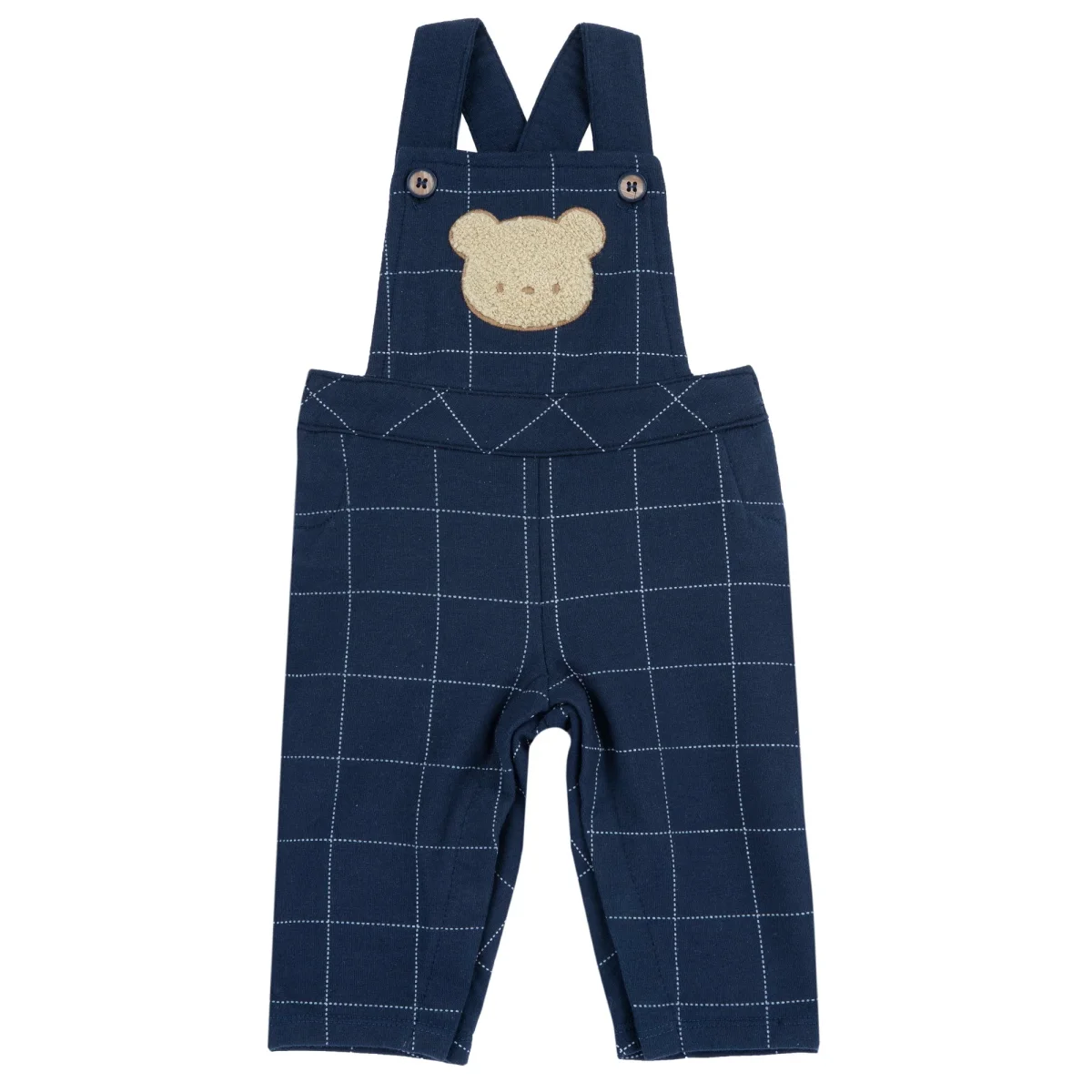 Salopette CHICCO in cotone con interno felpato a fantasia quadri, patch orsetto teddy applicato in colore a contrasto, bretelle regolabili mediante bottoni, logo a rilievo applicato sul retro, chiusura con clips.