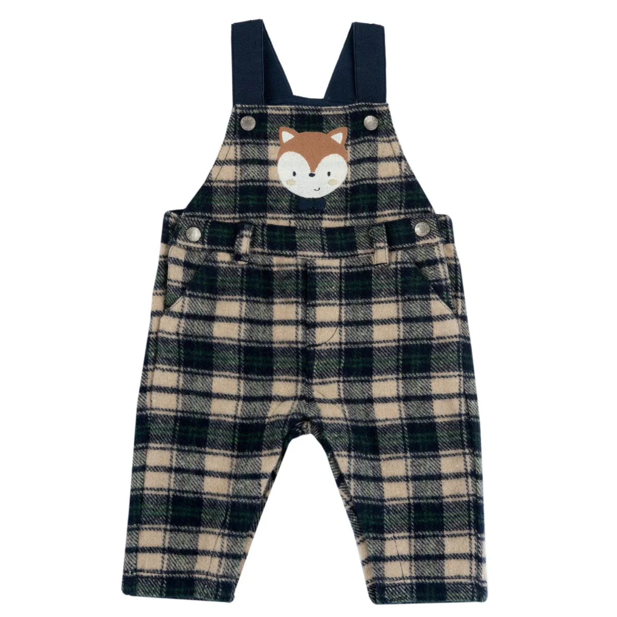 Salopette CHICCO in misto lana a fantasia quadri con tasche laterali, ricamo applicato, chiusura con clips logate laterali, bretelle elastiche regolabili mediante clips.