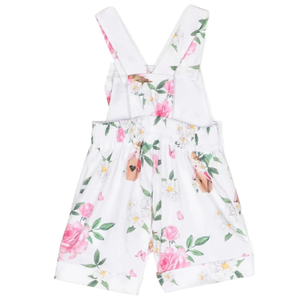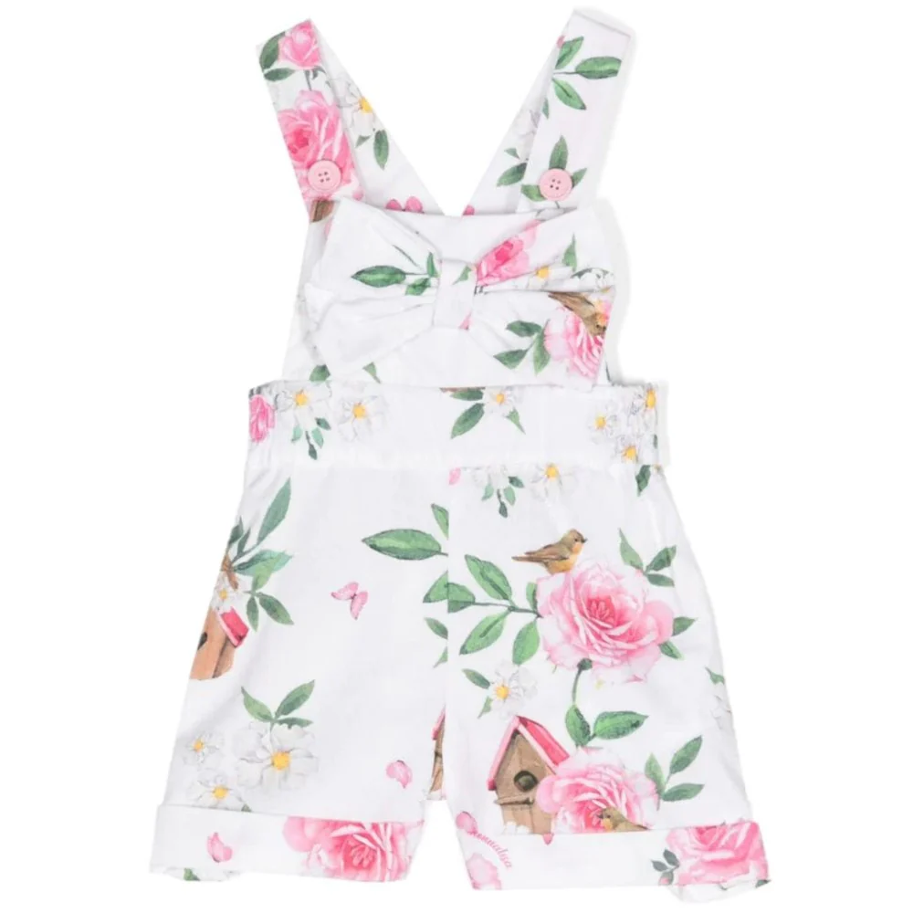 Salopette MONNALISA in cotone a fantasia floreale logata elastico in vita fiocco applicato chiusura regolabile alle bretelle con bottoncini logati.