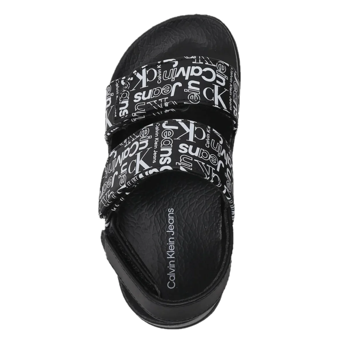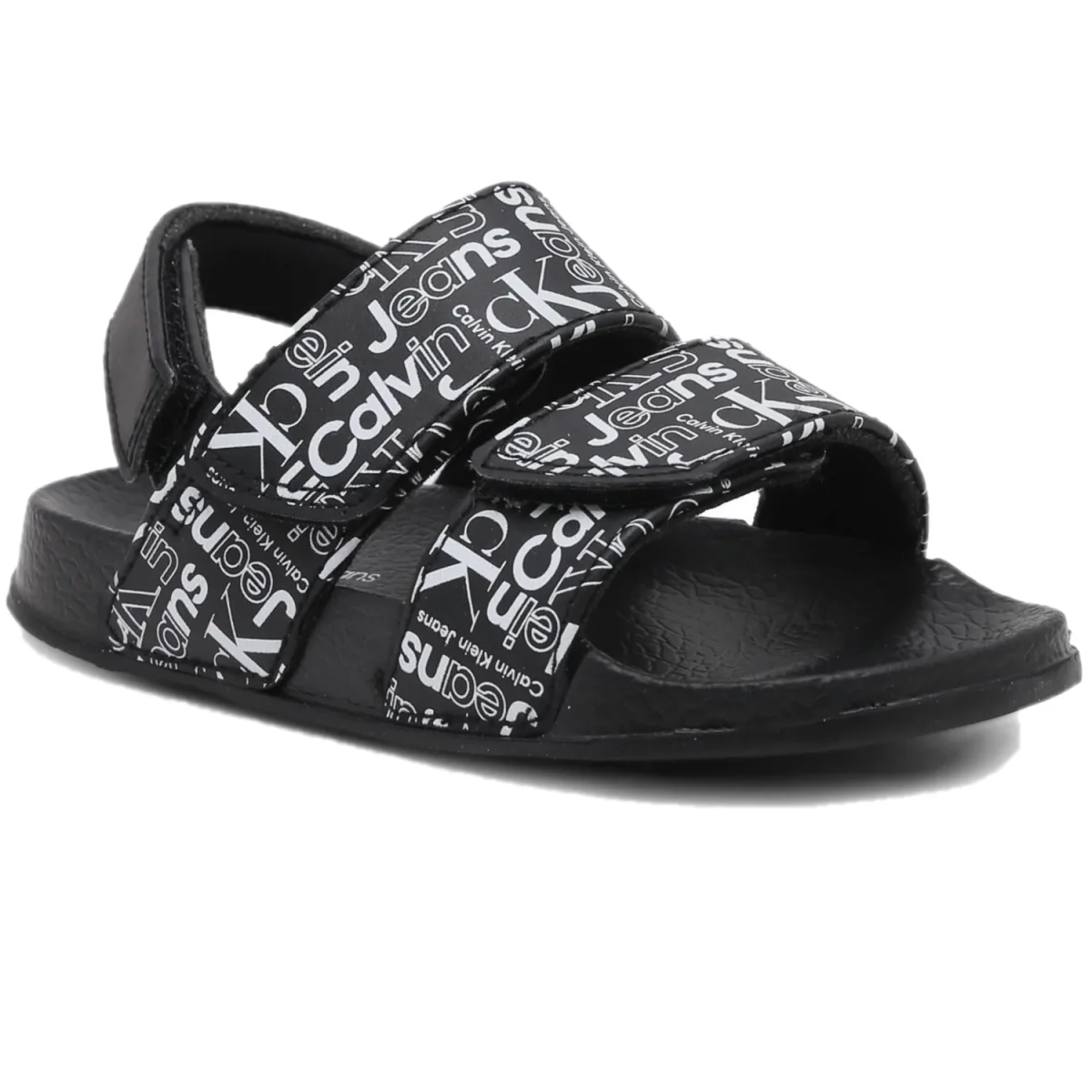 Sandali CALVIN KLEIN per bambino neri a fantasia maxi logo ck, chiusura con doppio strappo. fondo in gomma antiscivolo.
