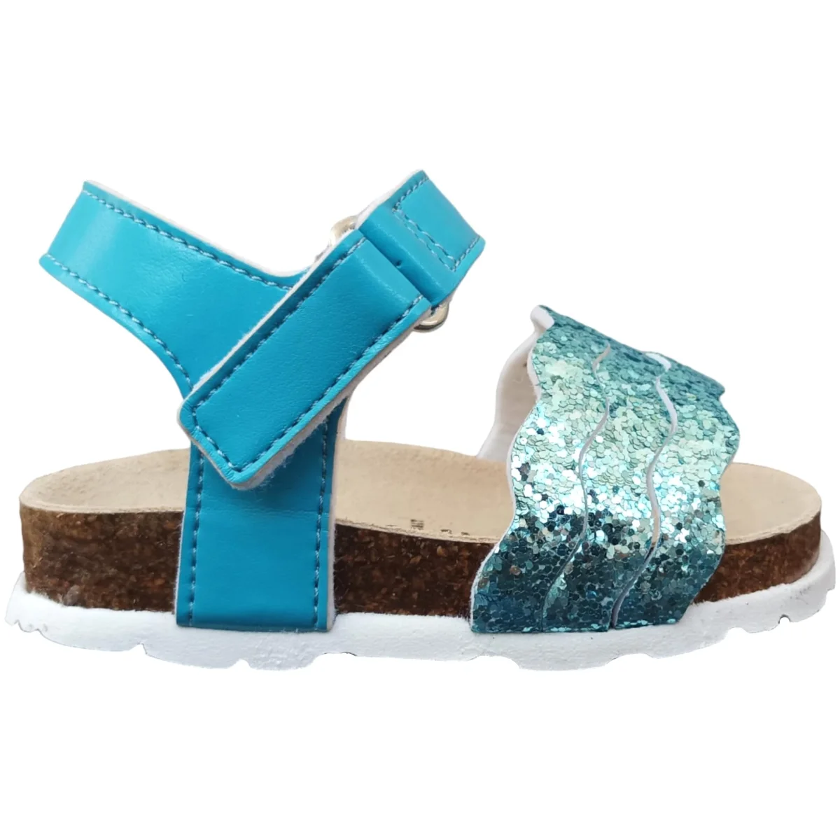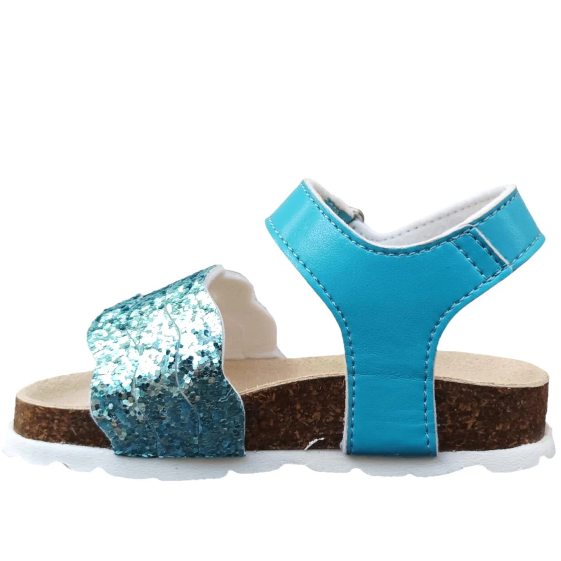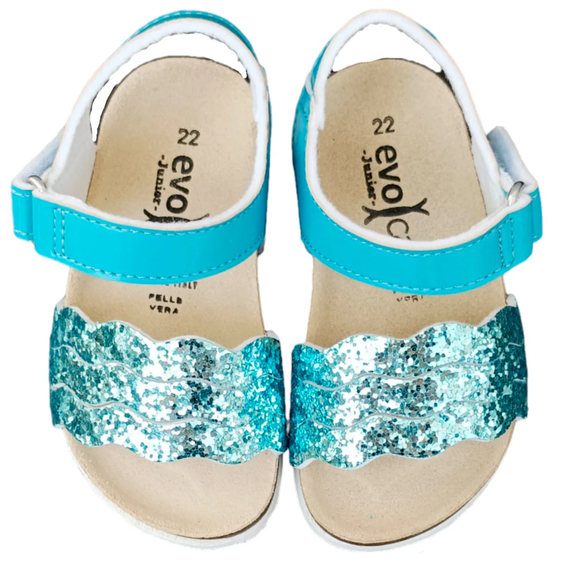Sandali EVOCA in ecopelle ,chiusura con strappo regolabile,applicazione glitter, sottopiede in vera pelle anatomico, fondo in gomma. MADE IN ITALY
