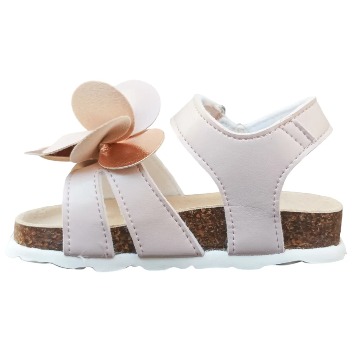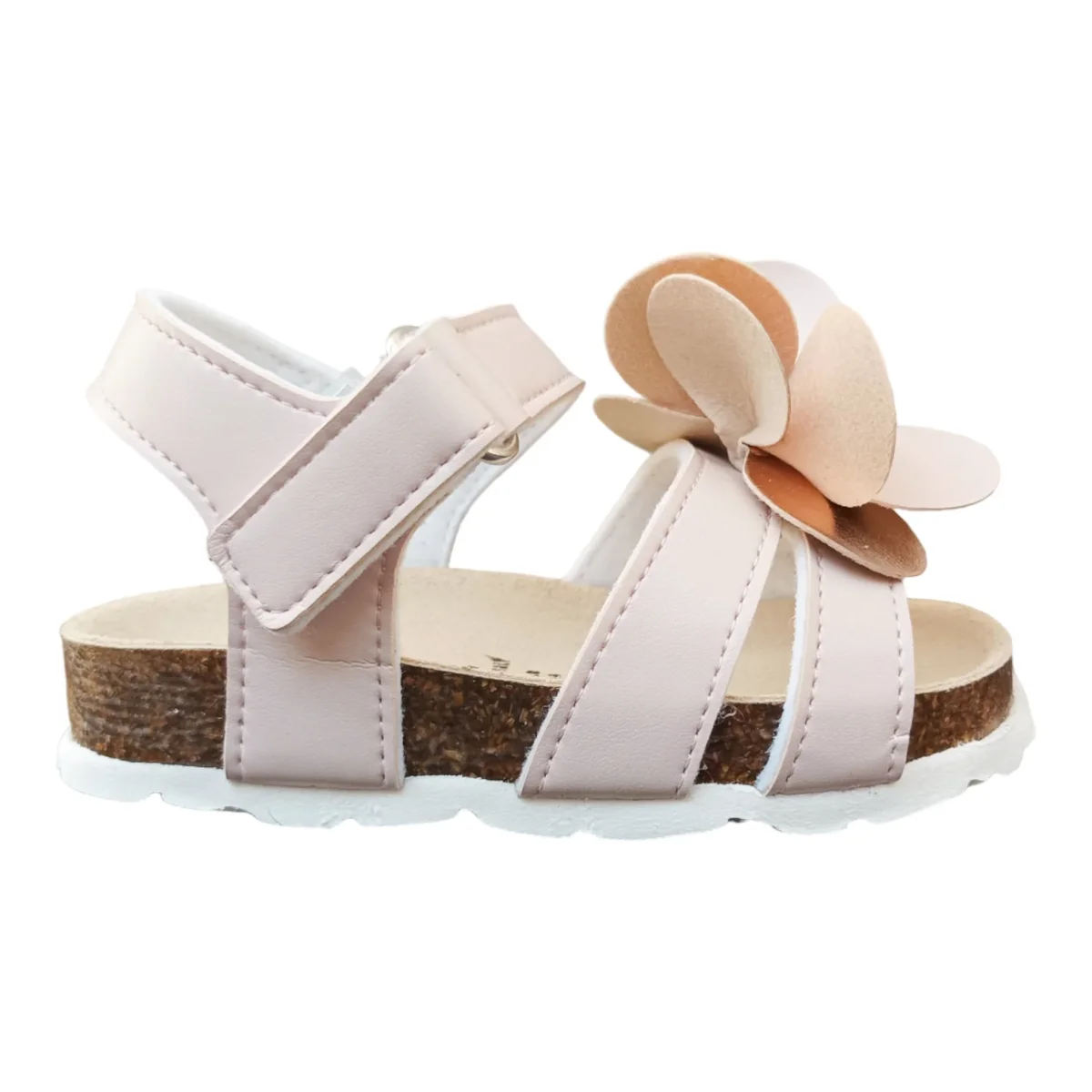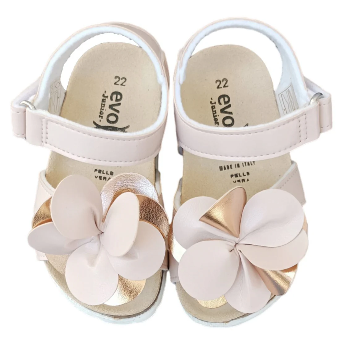 Sandalo EVOCA in ecopelle ,chiusura con strappo regolabile,applicazione floreale bicolor, sottopiede in vera pelle anatomico, fondo in gomma. MADE IN ITALY