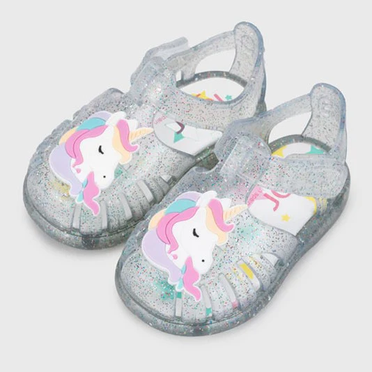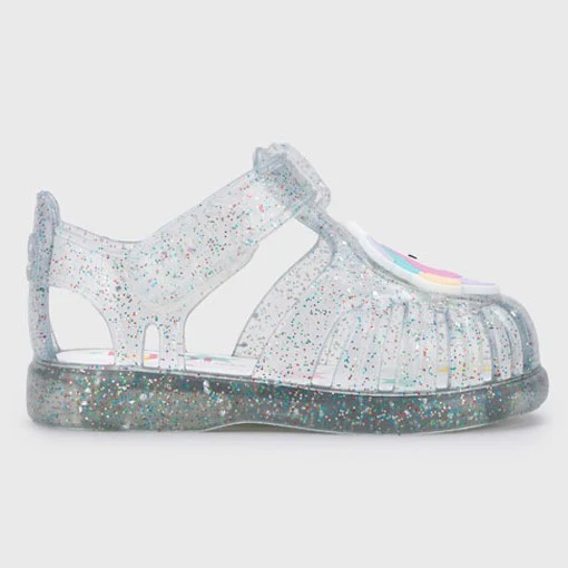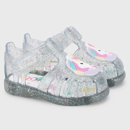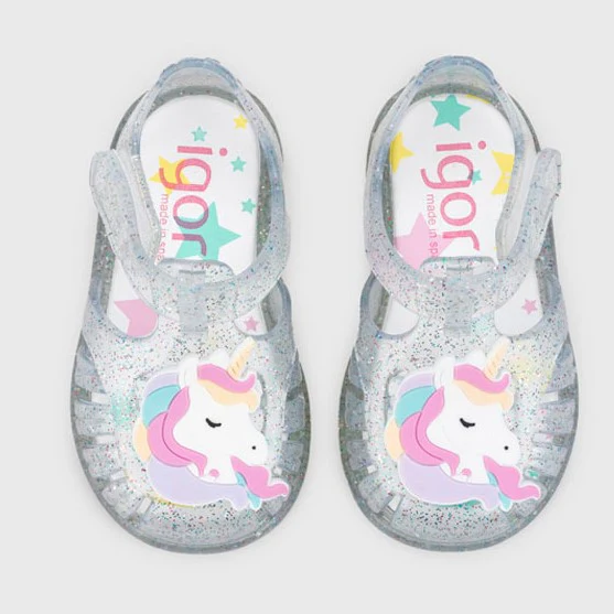 Sandali IGOR in morbida gomma glitterata con unicorno applicato in colore a contrasto, chiusura con velcro e logo applicato, comodo sottopiede. Made in Spain.