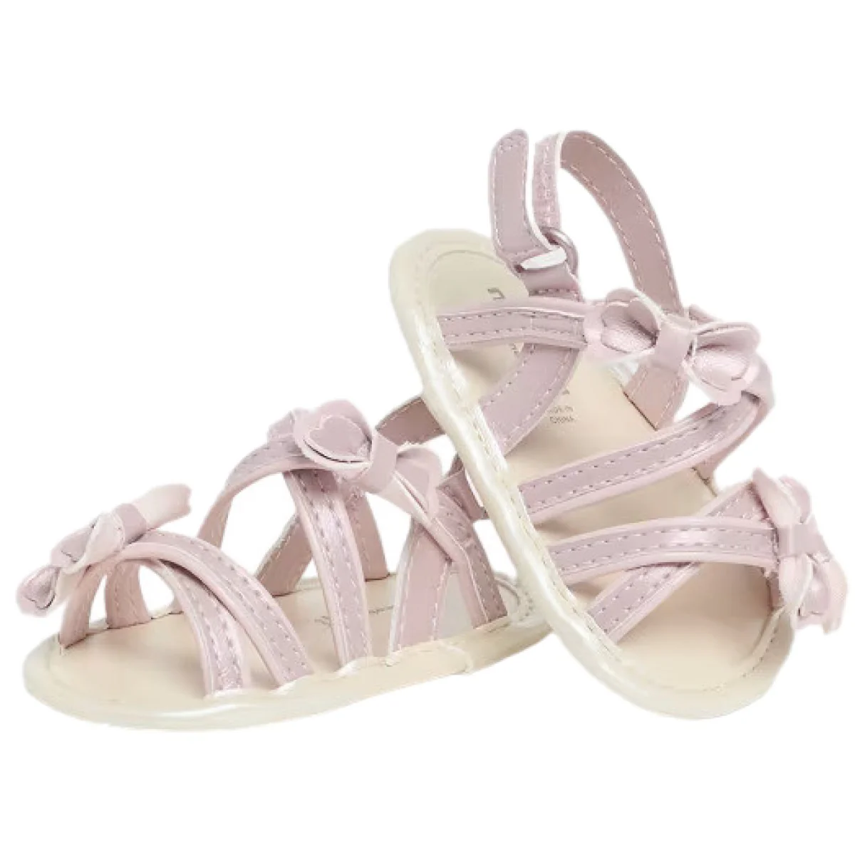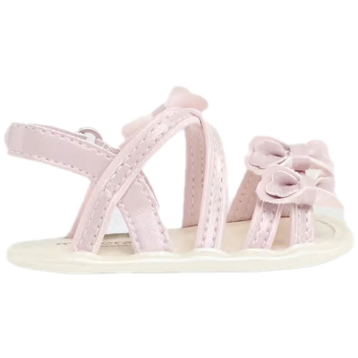 Sandali MAYORAL linea culla in ecopelle con fiocchi applicati e chiusura con velcro.