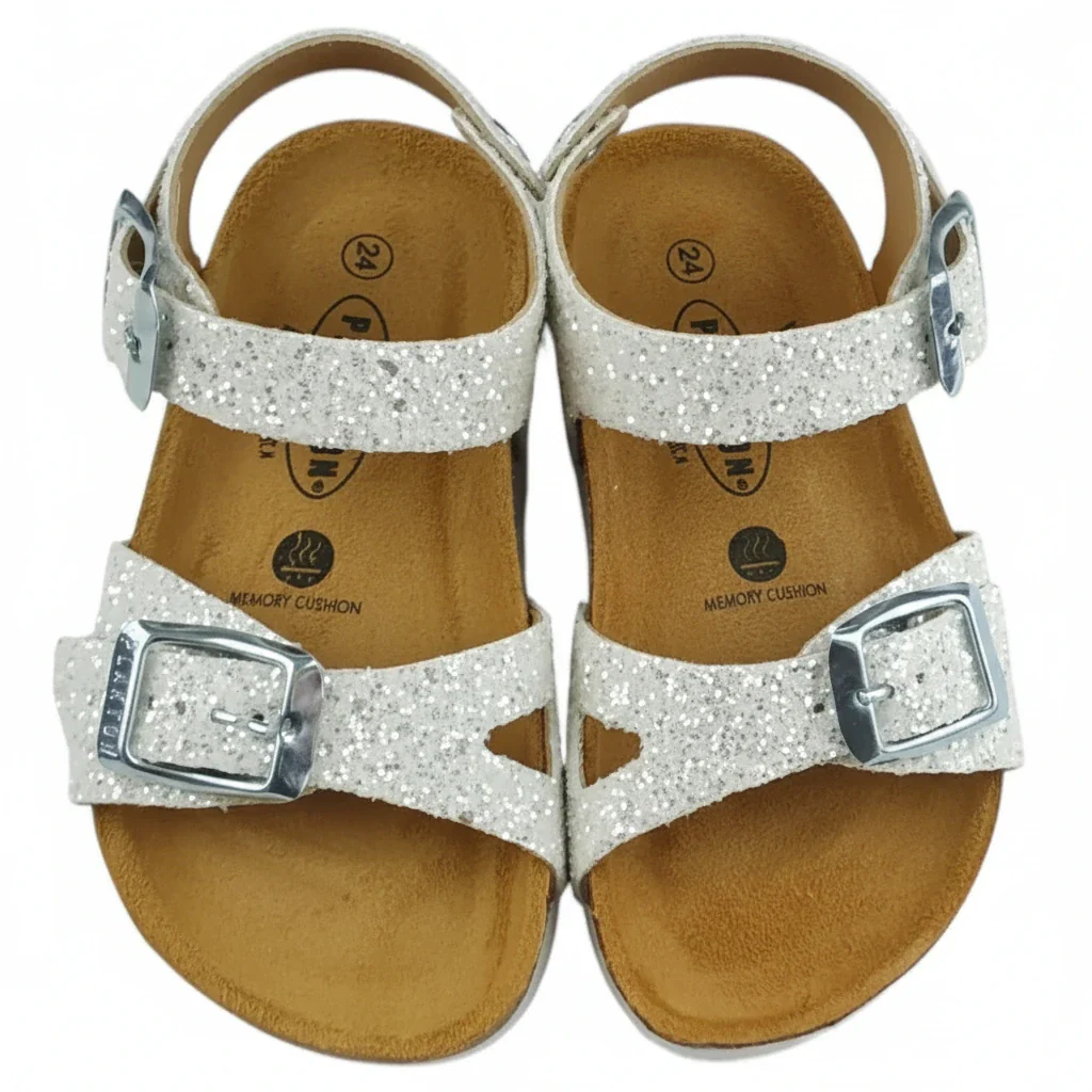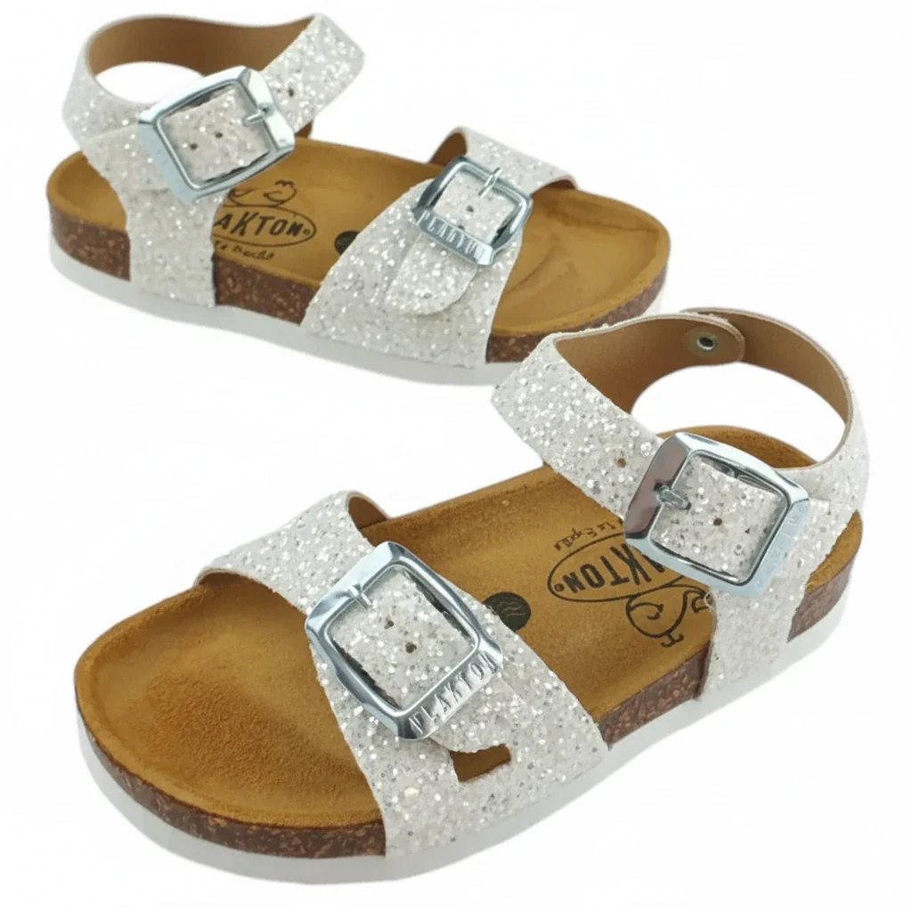 Sandali PLAKTON per bambina con glitter applicati, chiusura con fibbie regolabili, sottopiede in vera pelle, fondo in gomma antiscivolo.