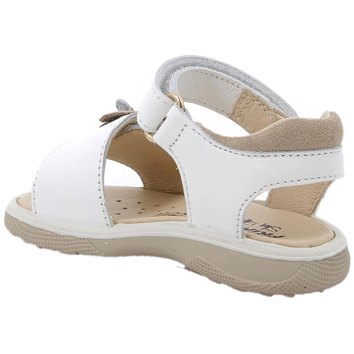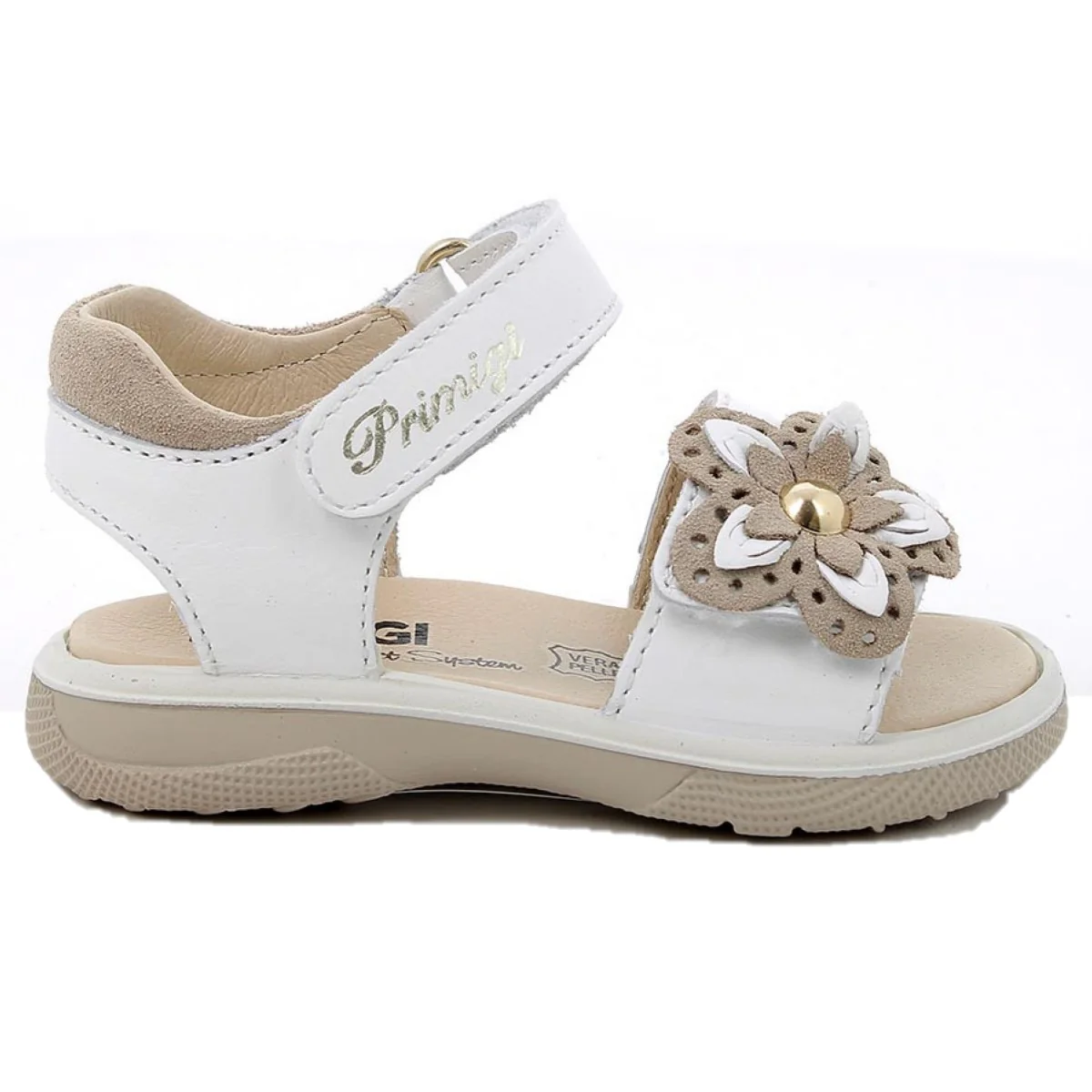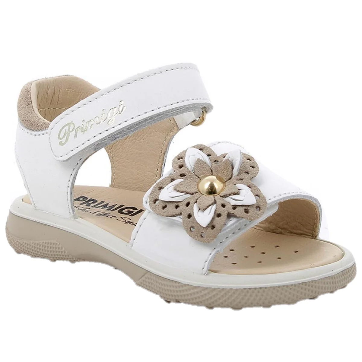 Sandali PRIMIGI in vera pelle con chiusura doppio velcro regolabile, fiore applicato in colore a contrasto, logo stampato applicato, sottopiede in vera pelle, fondo flessibile in gomma antiscivolo.
