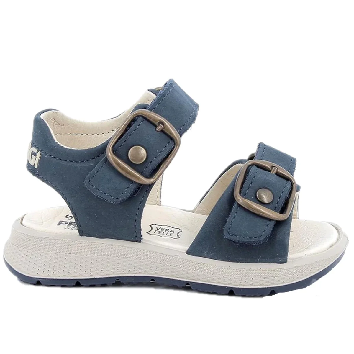 Sandali PRIMIGI in vera pelle, chiusura con doppio velcro regolabile con finte fibbie applicate, logo a rilievo applicato sul retro, sottopiede in vera pelle, fondo in gomma antiscivolo.
