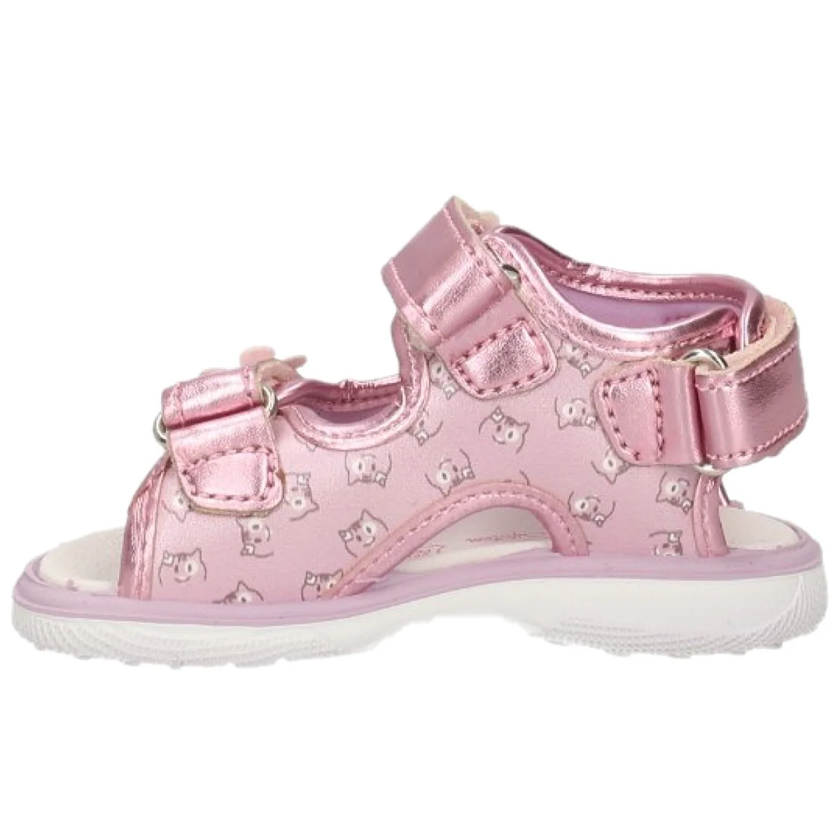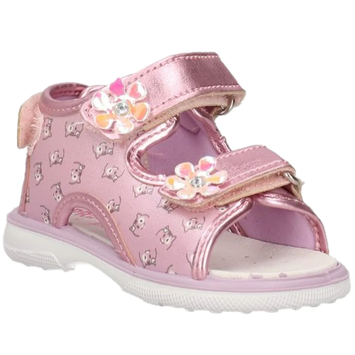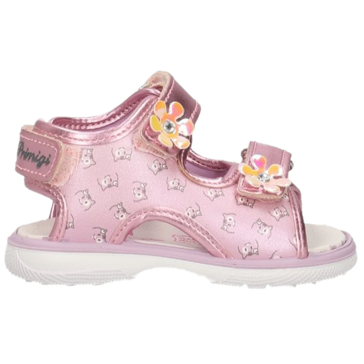 Sandali PRIMIGI a fantasia con chiusura triplo velcro regolabile, fiorellini con strass applicati, logo stampato sul retro, sottopiede in vera pelle, fondo flessibile in gomma antiscivolo.