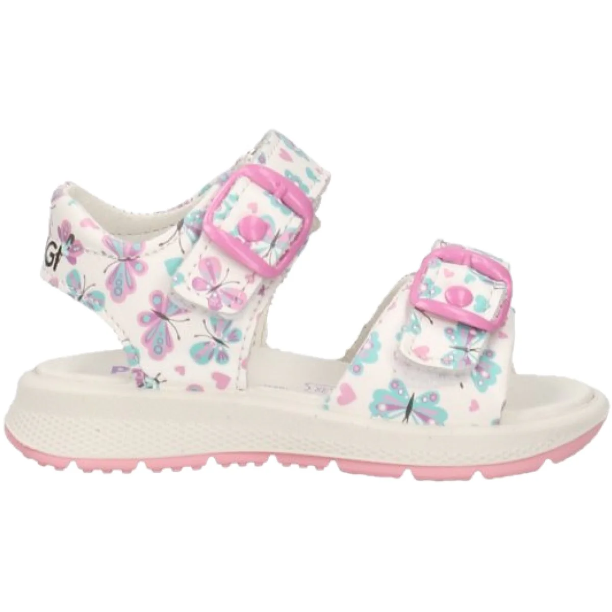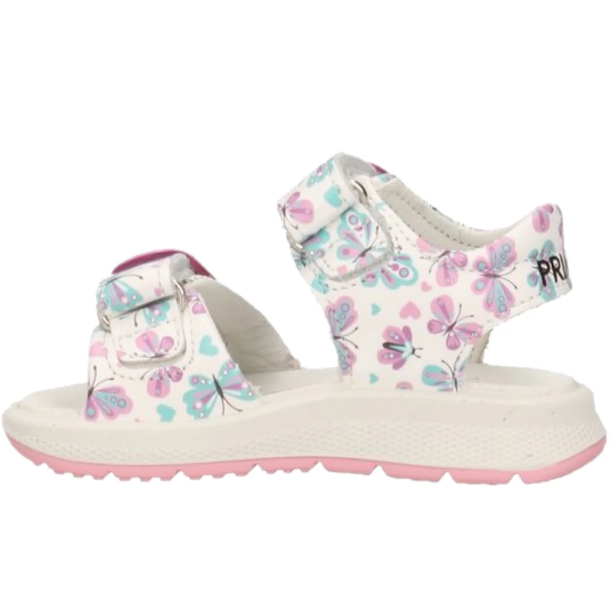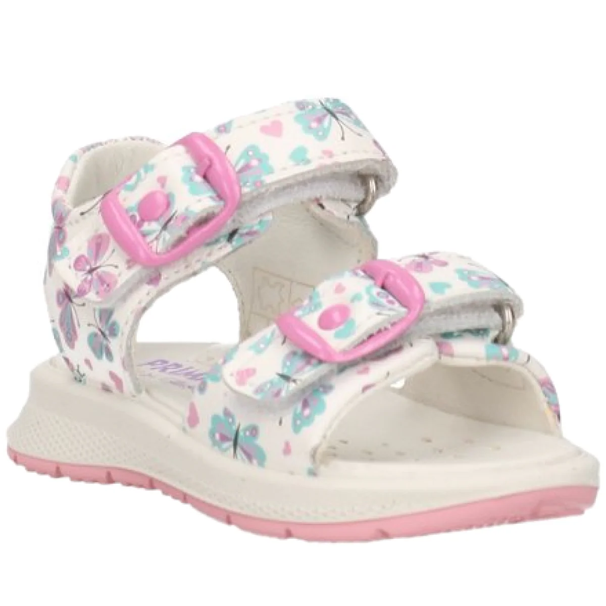 Sandali PRIMIGI in vera pelle a fantasia farfalle in colori a contrasto, chiusura con doppio velcro regolabile, logo stampato sul retro, sottopiede in vera pelle, fondo in gomma antiscivolo.