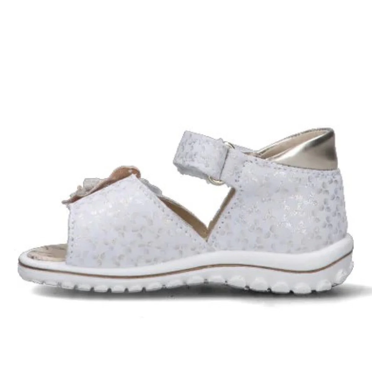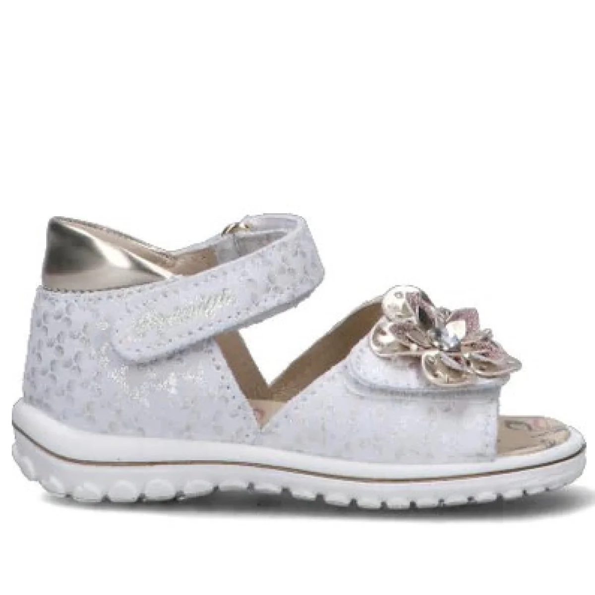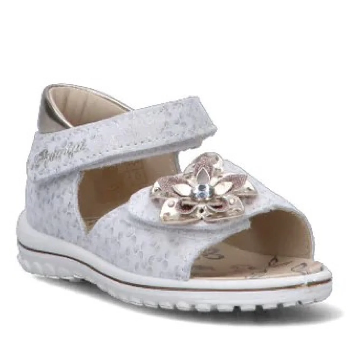 Sandali PRIMIGI in vera pelle a fantasia con chiusura doppio velcro regolabile, fiore applicato in colore a contrasto con strass, logo stampato applicato, sottopiede in vera pelle, fondo flessibile in gomma antiscivolo.