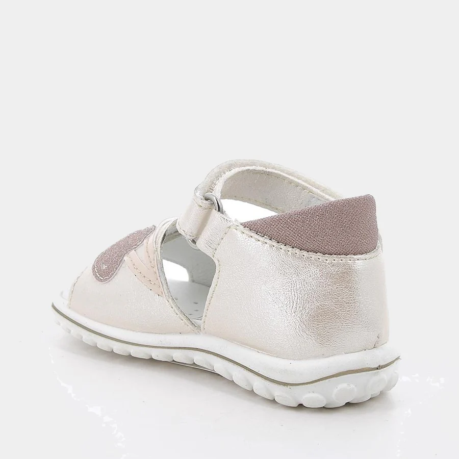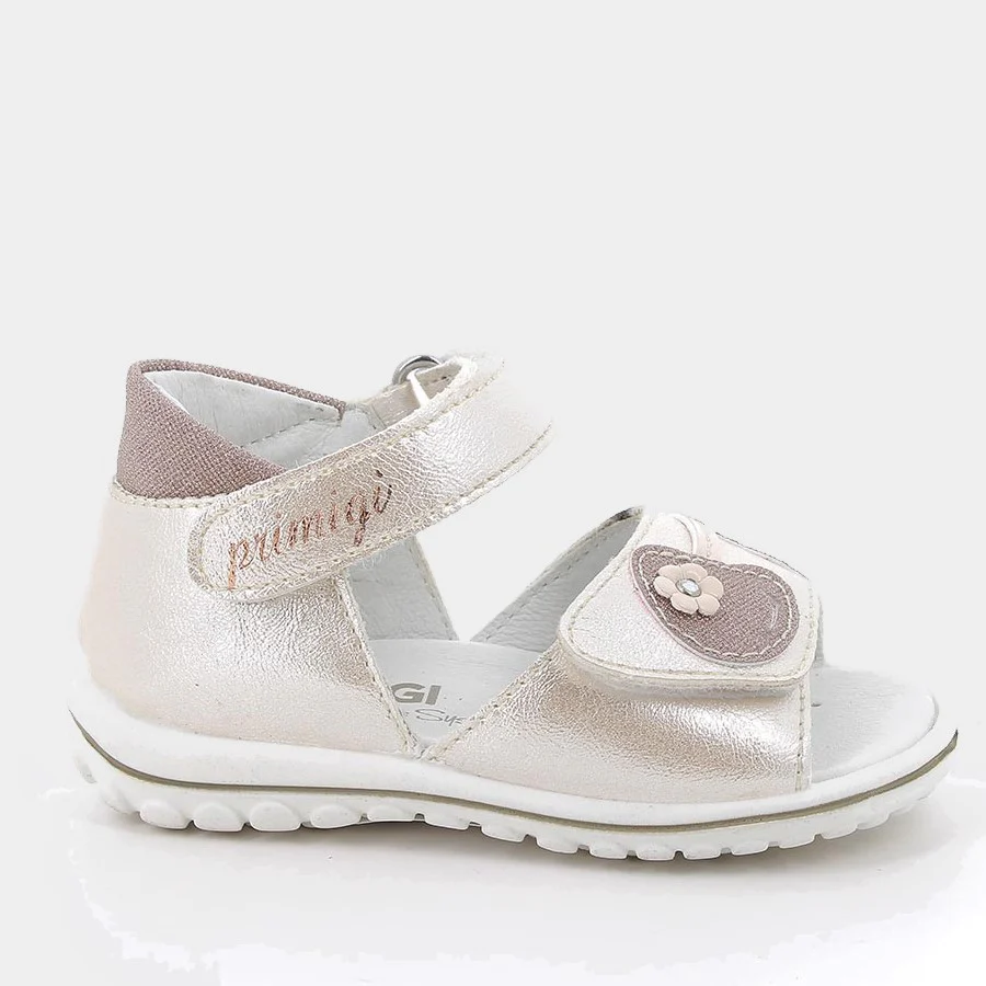 Sandali PRIMIGI, modello primi passi, in ecopelle con chiusura doppio velcro regolabile, con inserti laminati e in vernice applicati, fiorellino con strass e logo applicato, sottopiede in vera pelle, fondo in gomma antiscivolo.
