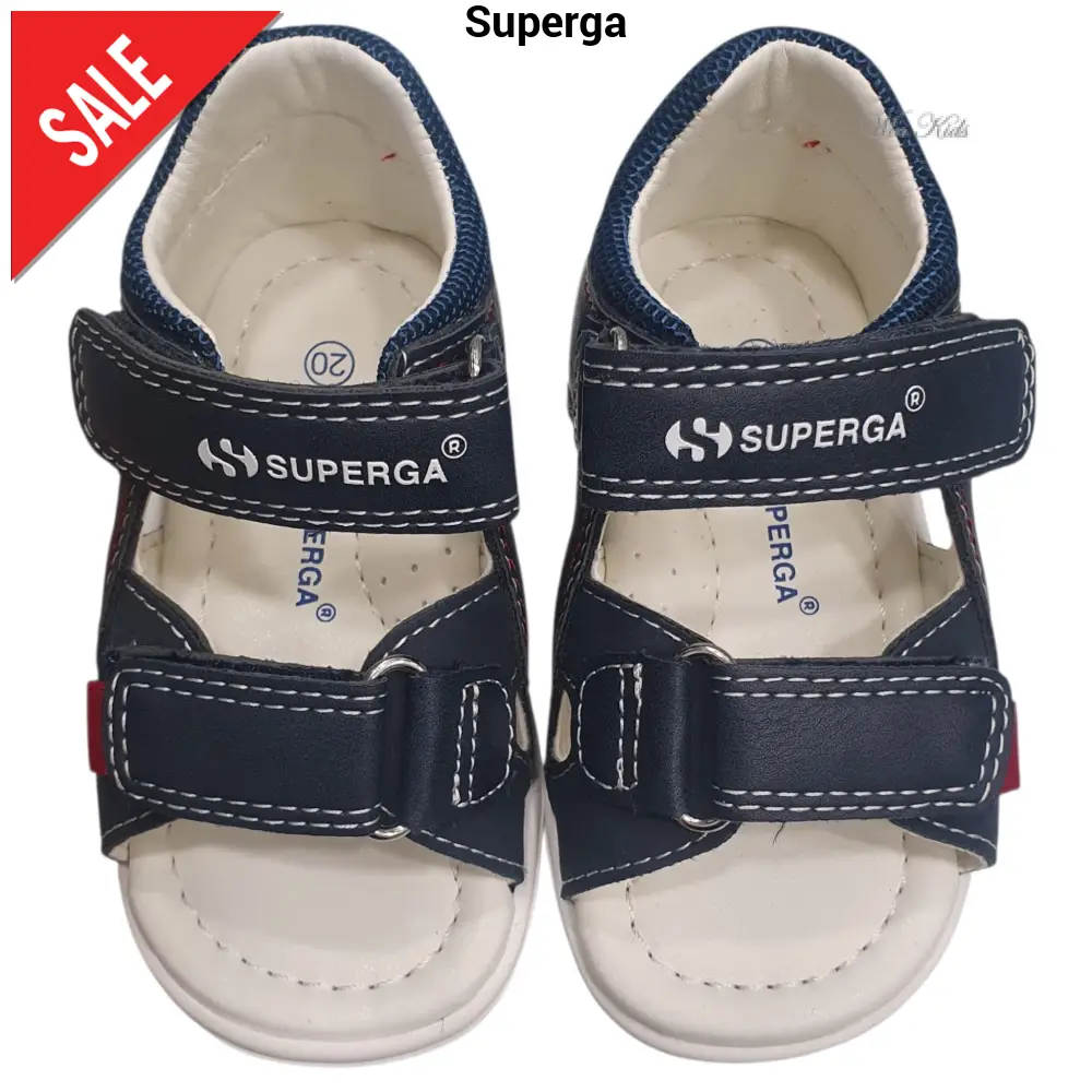 Sandali SUPERGA primi passi in ecopelle con chiusura con velcro , sotto piede in vera pelle fondo in gomma antiscivolo e flessibile.
